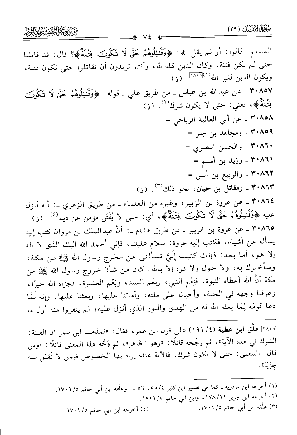 ٣٠٨٦٤ - عن عروة بن الزبير، وغيره من العلماء -من طريق الزهري-: أنه أنزل عليه {وقاتلوهم حتى لا تكون فتنة}، أي: حتى لا يُفْتَن مؤمن عن دينه (¬٤). (ز)