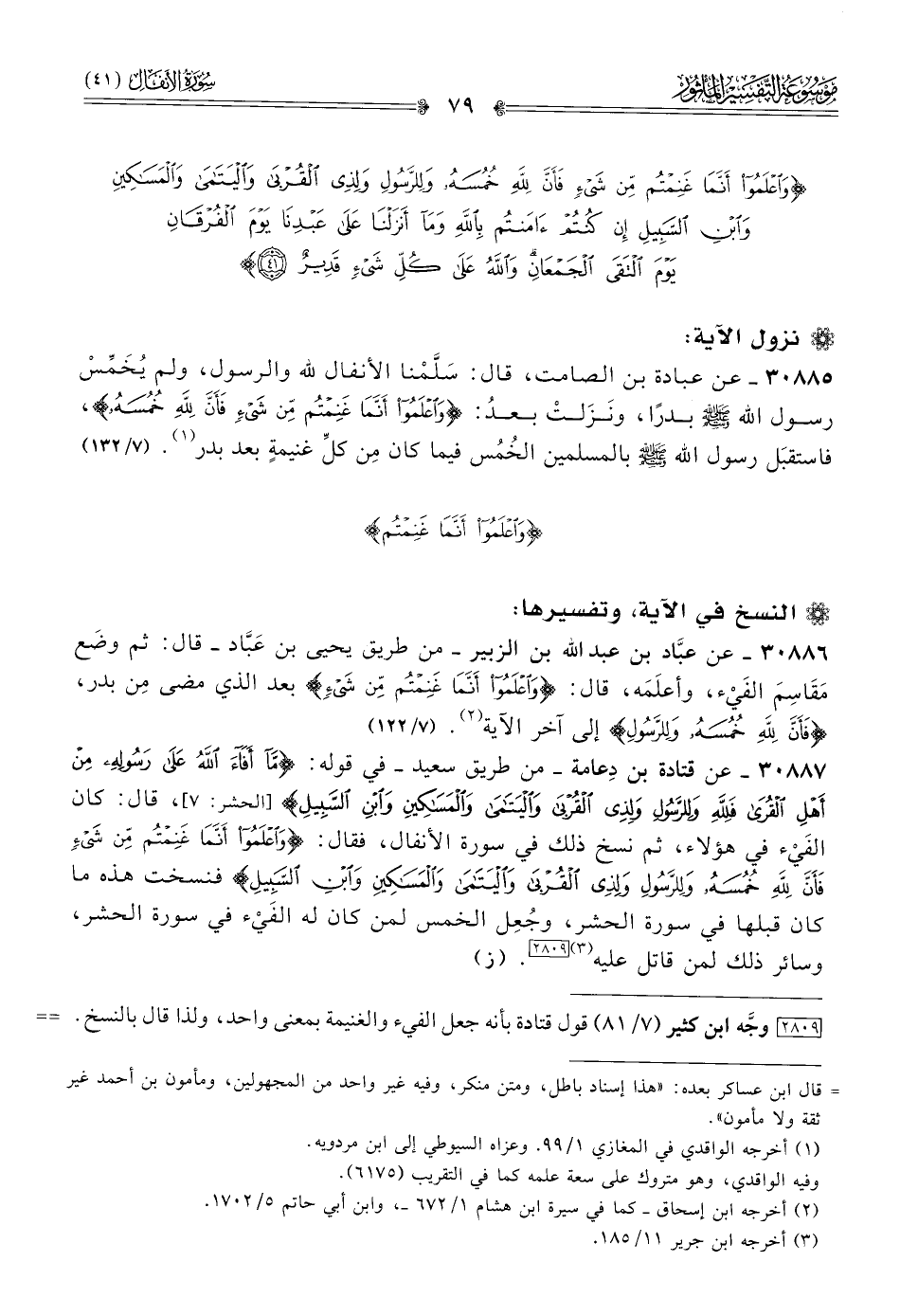 ٣٠٨٨٥ - عن عبادة بن الصامت، قال: سَلَّمْنا الأنفال لله والرسول، ولم يُخَمِّسْ رسول الله - صلى الله عليه وسلم - بدرًا، ونَزَلتْ بعدُ: {واعلموا أنما غنمتم من شيء فأن لله خمسه}، فاستقبَل رسول الله - صلى الله عليه وسلم - بالمسلمين الخُمُس فيما كان مِن كلِّ غنيمةٍ بعد بدر (¬١). (٧/ ١٣٢)
