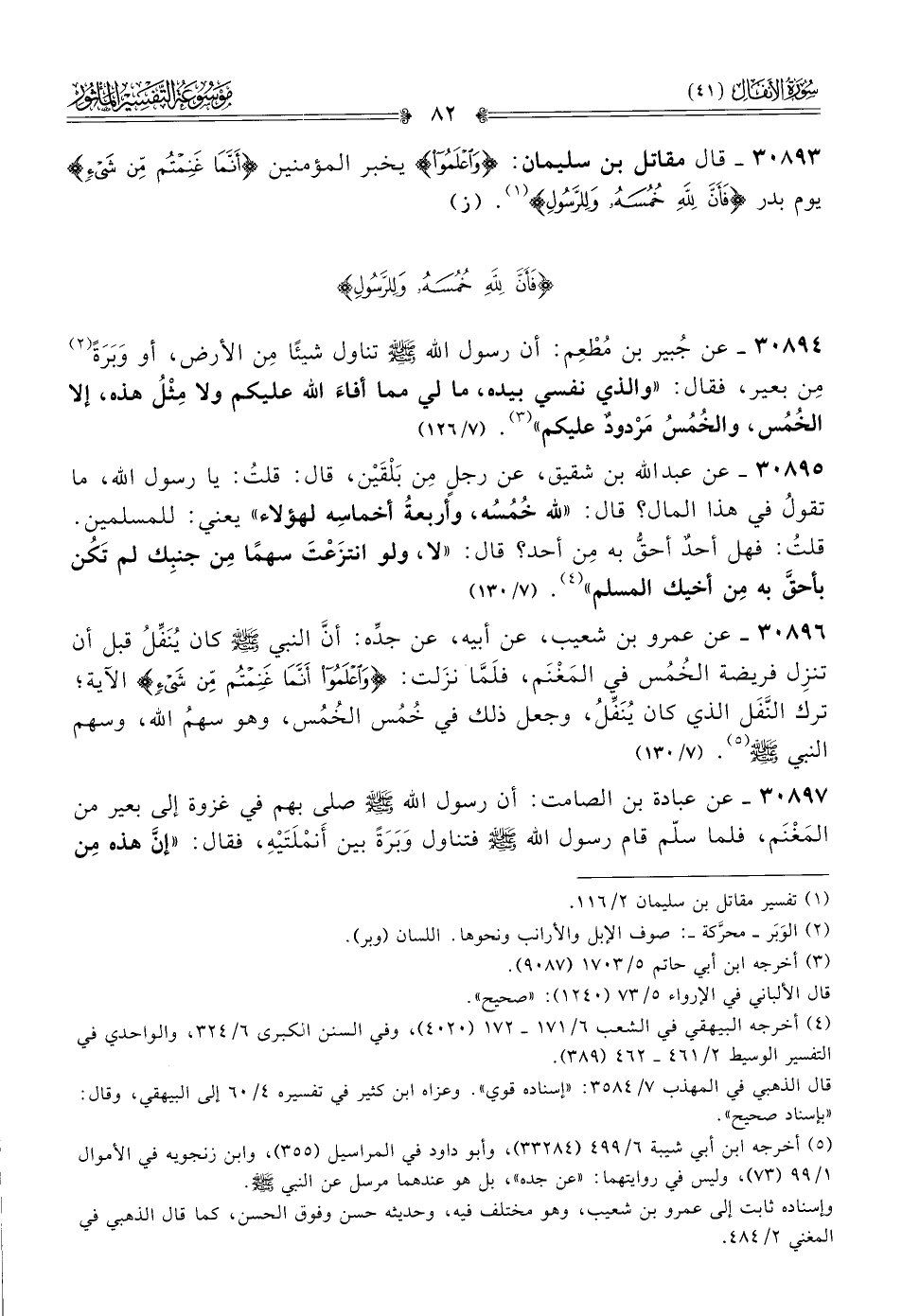 ٣٠٨٩٦ - عن عمرو بن شعيب، عن أبيه، عن جدِّه: أنّ النبي - صلى الله عليه وسلم - كان يُنَفِّلُ قبل أن تنزِل فريضة الخُمُس في المَغْنَم، فلَمّا نزَلت: {واعلموا أنما غنمتم من شيء} الآية؛ ترك النَّفَل الذي كان يُنَفِّلُ، وجعل ذلك في خُمُس الخُمُس، وهو سهمُ الله، وسهم النبي - صلى الله عليه وسلم - (¬٥). (٧/ ١٣٠)