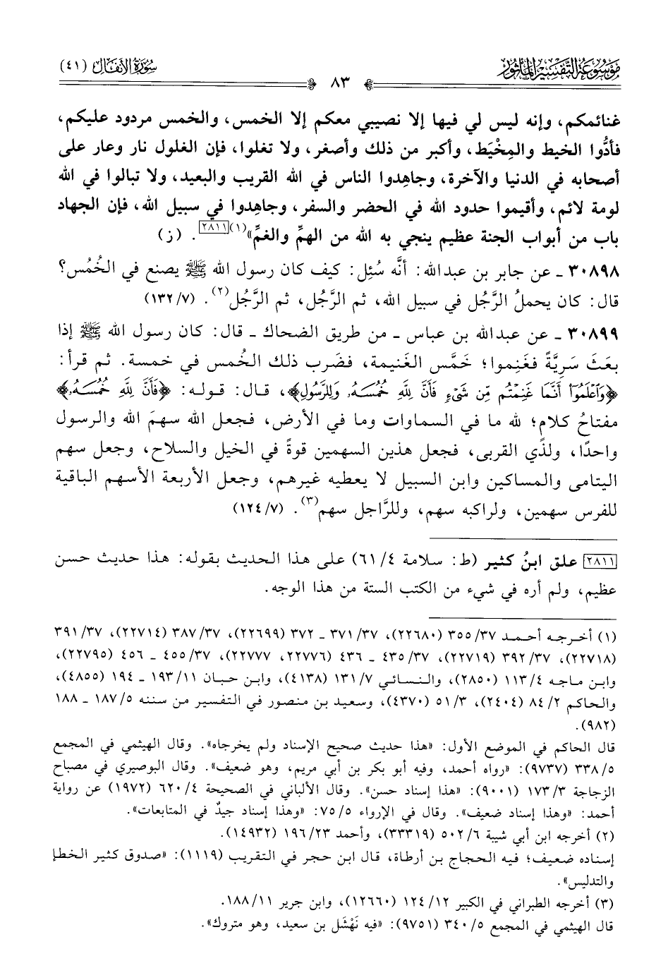 ٣٠٨٩٨ - عن جابر بن عبد الله، أنّه سُئِل: كيف كان رسول الله - صلى الله عليه وسلم - يصنع في الخُمُس؟ قال: كان يحمل الرَّجُل في سبيل الله، ثم الرَّجُل، ثم الرَّجُل (¬٢). (٧/ ١٣٢)
