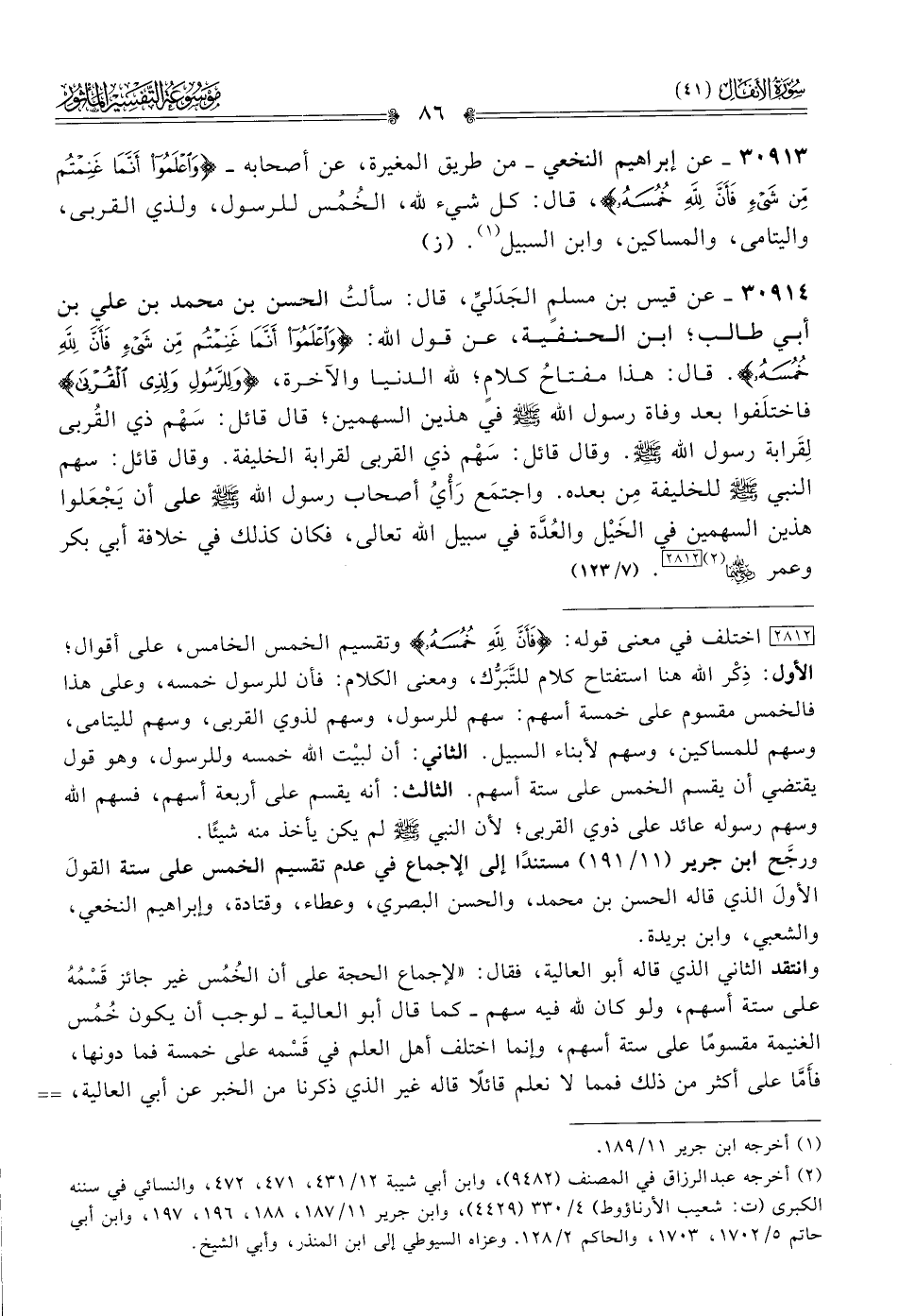 ٣٠٩١٣ - عن إبراهيم النخعي -من طريق المغيرة، عن أصحابه- {واعلموا أنما غنمتم من شيء فأن لله خمسه}، قال: كل شيء لله، الخُمُس للرسول، ولذي القربى، واليتامى، والمساكين، وابن السبيل (¬١). (ز)