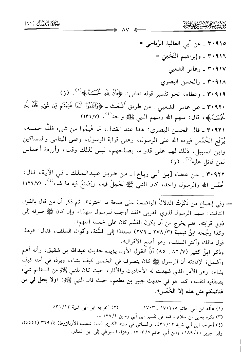 ٣٠٩٢٠ - عن عامر الشعبي -من طريق أشْعَث- {واعلموا أنما غنمتم من شيء فأن لله خمسه}، قال: سهم الله وسهم النبي - صلى الله عليه وسلم - واحد (¬٢). (٧/ ١٣١)