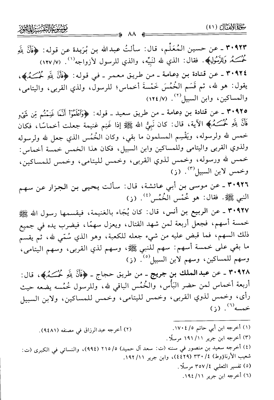 ٣٠٩٢٥ - عن قتادة بن دِعامة -من طريق سعيد- قوله: {واعلموا أنما غنمتم من شيء فأن لله خمسه} الآية، قال: كان نَبِيُّ الله - صلى الله عليه وسلم - إذا غَنِم غنيمة جعلت أخماسًا، فكان خمس لله ولرسوله، ويَقْسِم المسلمون ما بقي، وكان الخُمُس الذي جعل لله ولرسوله ولذوي القربى واليتامى وللمساكين وابن السبيل، فكان هذا الخمس خمسة أخماس: خمس لله ورسوله، وخمس لذوي القربى، وخمس لليتامى، وخمس للمساكين، وخمس لابن السبيل (¬٣). (ز)