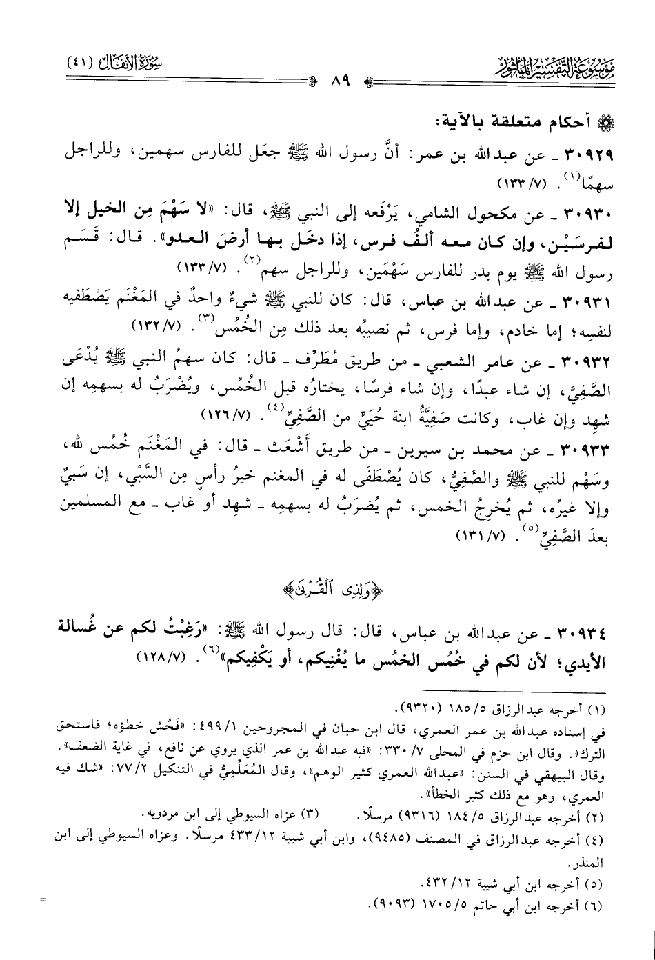 ٣٠٩٣٢ - عن عامر الشعبي -من طريق مُطَرِّف- قال: كان سهمُ النبي - صلى الله عليه وسلم - يُدْعى الصَّفِيَّ، إن شاء عبدًا، وإن شاء فرسًا، يختارُه قبل الخُمُس، ويُضْرَبُ له بسهمِه إن شهِد وإن غاب، وكانت صَفِيَّةُ ابنة حُيَيٍّ من الصَّفِيِّ (¬٤).