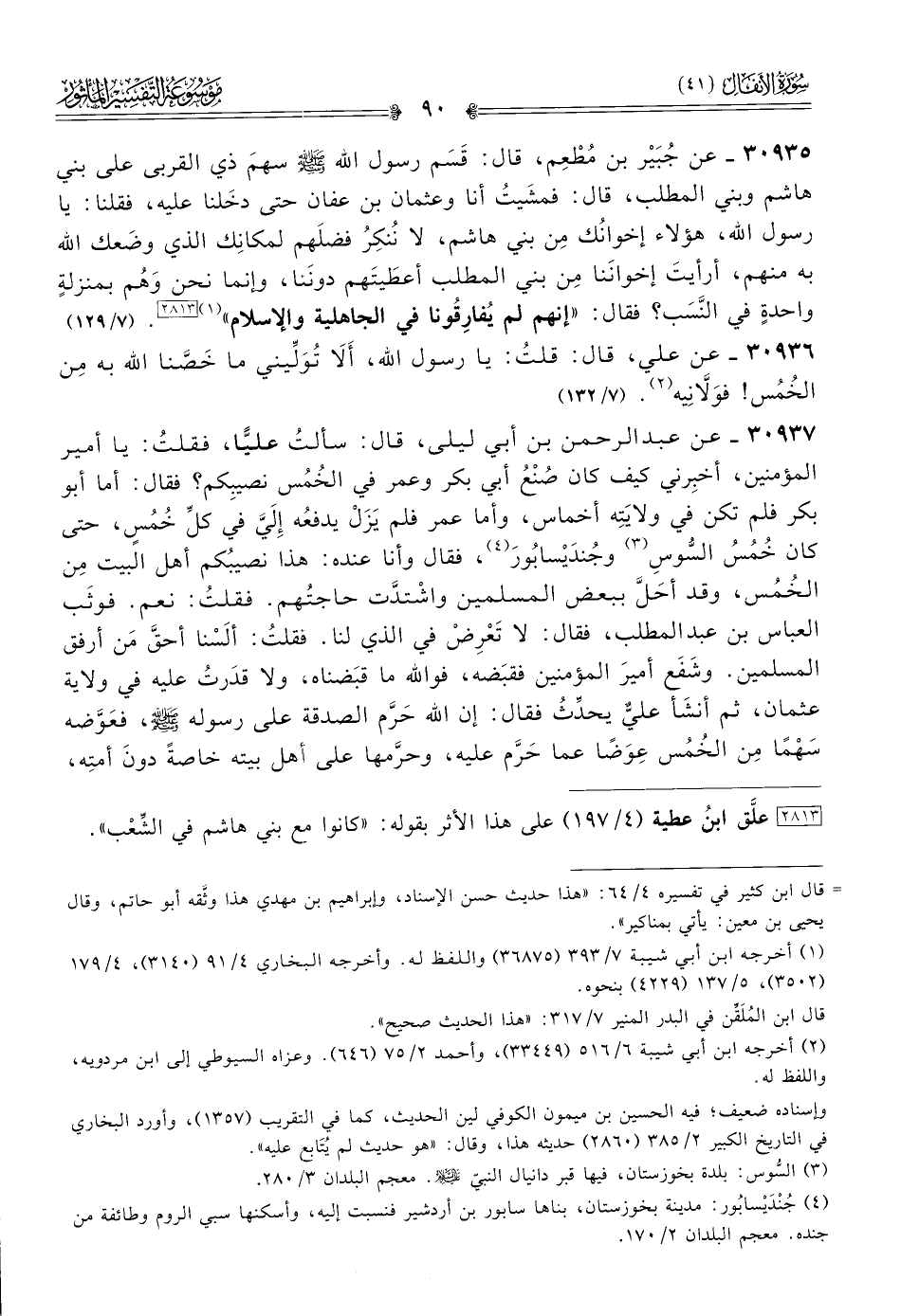 ٣٠٩٣٧ - عن عبد الرحمن بن أبي ليلى، قال: سألتُ عليًّا، فقلتُ: يا أمير المؤمنين، أخبِرني كيف كان صُنْعُ أبي بكر وعمر في الخُمُس نصيبِكم؟ فقال: أما أبو بكر فلم تكن في ولايَتِه أخماس، وأما عمر فلم يَزَلْ يدفعُه إلَيَّ في كلِّ خُمُسٍ، حتى كان خُمُسُ السُّوسِ (¬٣) وجُندَيْسابُورَ (¬٤)، فقال وأنا عنده: هذا نصيبُكم أهل البيت مِن الخُمُس، وقد أحَلَّ ببعض المسلمين واشْتدَّت حاجتُهم. فقلتُ: نعم. فوثَب العباس بن عبد المطلب، فقال: لا تَعْرِضْ في الذي لنا. فقلتُ: ألَسْنا أحقَّ مَن أرفق المسلمين. وشَفَع أميرَ المؤمنين فقبَضه، فوالله ما قبَضناه، ولا قدَرتُ عليه في ولاية عثمان، ثم أنشَأ عليٌّ يحدِّثُ فقال: إن الله حَرَّم الصدقة على رسوله - صلى الله عليه وسلم -، فعَوَّضه سَهْمًا مِن الخُمُس عِوَضًا عما حَرَّم عليه، وحرَّمها على أهل بيته خاصةً دونَ أمتِه،