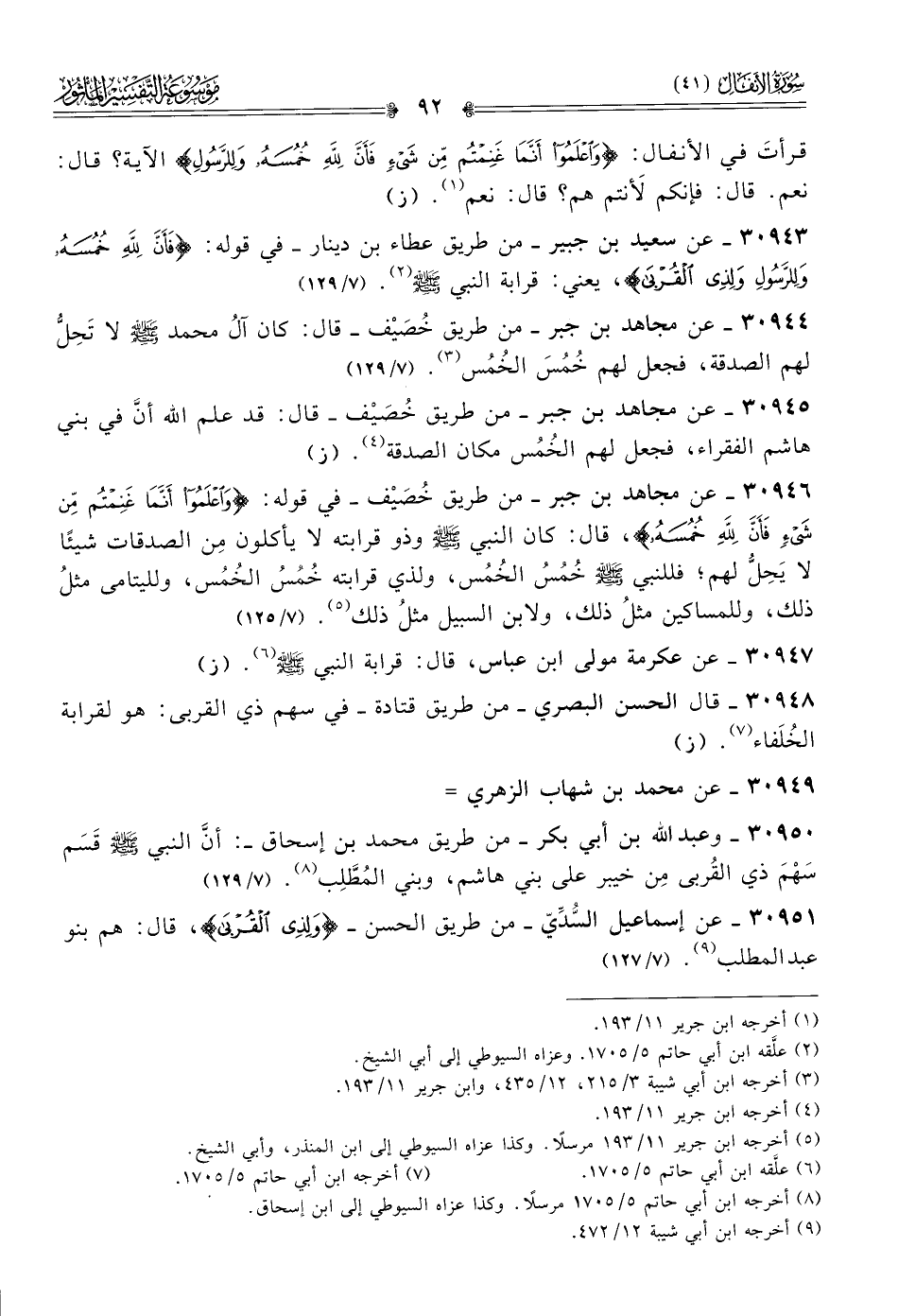 ٣٠٩٤٣ - عن سعيد بن جبير -من طريق عطاء بن دينار- في قوله: {فأن لله خمسه وللرسول ولذي القربى}، يعني: قرابة النبي - صلى الله عليه وسلم - (¬٢). (٧/ ١٢٩)