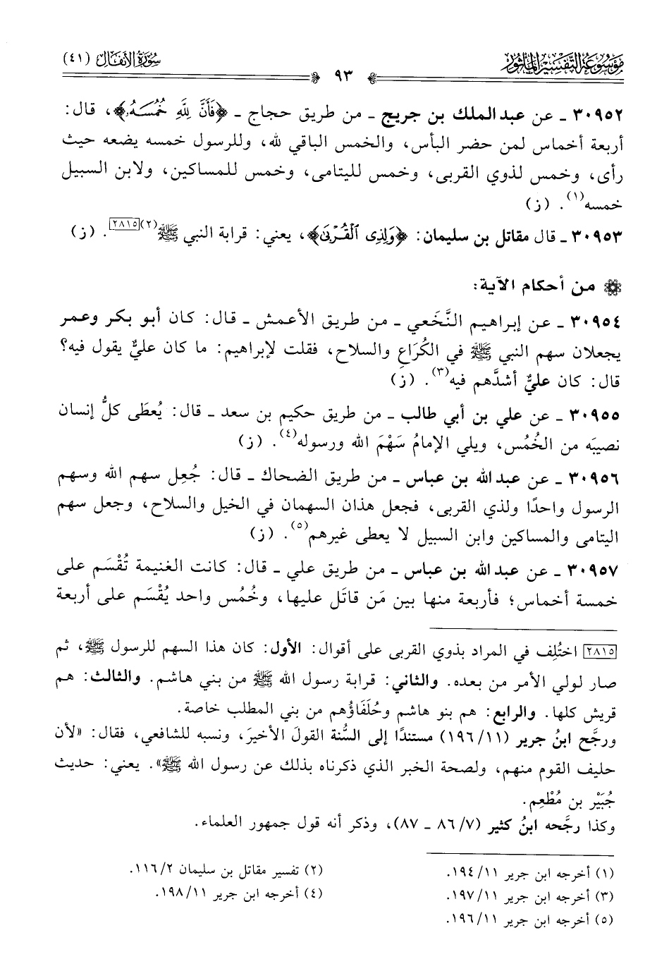 ٣٠٩٥٢ - عن عبد الملك بن جريج -من طريق حجاج- {فأن لله خمسه}، قال: أربعة أخماس لمن حضر البأس، والخمس الباقي لله، وللرسول خمسه يضعه حيث رأى، وخمس لذوي القربى، وخمس لليتامى، وخمس للمساكين، ولابن السبيل خمسه (¬١). (ز)