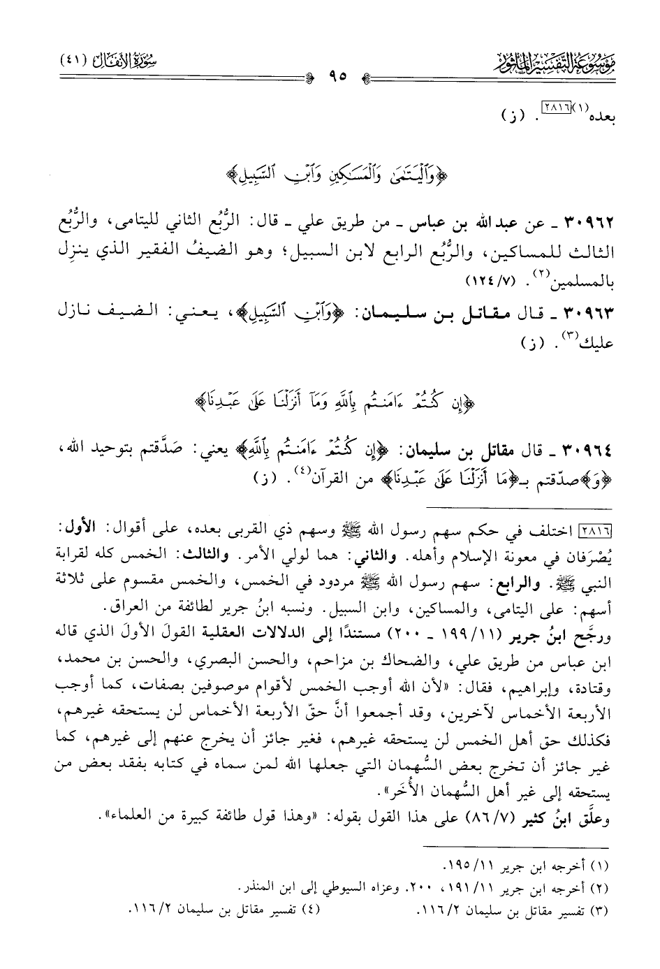٣٠٩٦٢ - عن عبد الله بن عباس -من طريق علي- قال: الرُّبُع الثاني لليتامى، والرُّبُع الثالث للمساكين، والرُّبُع الرابع لابن السبيل؛ وهو الضيفُ الفقير الذي ينزِل بالمسلمين (¬٢). (٧/ ١٢٤)