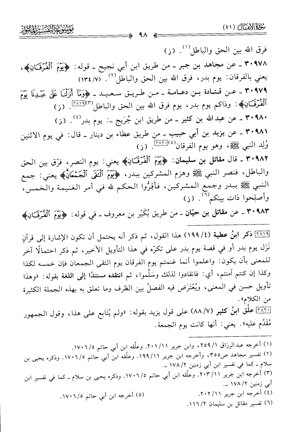٣٠٩٧٩ - عن قتادة بن دعامة -من طريق سعيد- {وما أنزلنا على عبدنا يوم الفرقان}: وذاكم يوم بدر، يوم فرق الله بين الحق والباطل (¬٣) [٢٨١٩]. (ز)