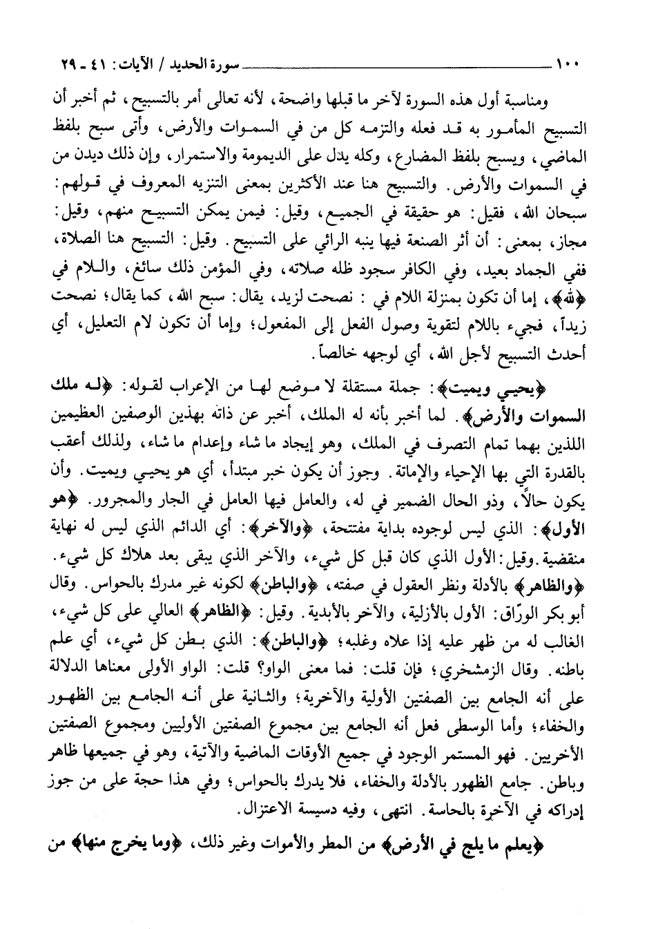 يُحْيِي وَيُمِيتُ: جُمْلَةٌ مُسْتَقِلَّةٌ لَا مَوْضِعَ لَهَا مِنَ الْإِعْرَابِ لِقَوْلِهِ: لَهُ مُلْكُ السَّماواتِ وَالْأَرْضِ لَمَّا أَخْبَرَ بِأَنَّهُ لَهُ الْمُلْكُ، أَخْبَرَ عَنْ ذَاتِهِ بِهَذَيْنِ الْوَصْفَيْنِ الْعَظِيمَيْنِ اللَّذَيْنِ بِهِمَا تَمَامُ التَّصَرُّفِ فِي الْمُلْكِ، وَهُوَ إِيجَادُ مَا شَاءَ وَإِعْدَامُ مَا شَاءَ، وَلِذَلِكَ أَعْقَبَ بِالْقُدْرَةِ الَّتِي بِهَا الْإِحْيَاءُ وَالْإِمَاتَةُ. وَجُوِّزَ أَنْ يَكُونَ خَبَرَ مُبْتَدَأٍ، أَيْ هُوَ يُحْيِي وَيُمِيتُ. وَأَنْ يَكُونَ حَالًا، وَذُو الْحَالِ الضَّمِيرُ فِي لَهُ، وَالْعَامِلُ فِيهَا الْعَامِلُ فِي الْجَارِّ وَالْمَجْرُورِ. هُوَ الْأَوَّلُ: الَّذِي لَيْسَ لِوُجُودِهِ بِدَايَةٌ مُفْتَتَحَةٌ، وَالْآخِرُ: أَيِ الدَّائِمُ الَّذِي لَيْسَ لَهُ نِهَايَةٌ مُنْقَضِيَةٌ. وَقِيلَ: الْأَوَّلُ الَّذِي كَانَ قَبْلَ كُلِّ شَيْءٍ، وَالْآخِرُ الَّذِي يَبْقَى بَعْدَ هَلَاكِ كُلِّ شَيْءٍ.