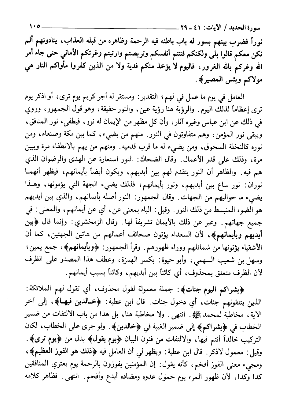 قَوْلُهُ عَزَّ وَجَلَّ: يَوْمَ تَرَى الْمُؤْمِنِينَ وَالْمُؤْمِناتِ يَسْعى نُورُهُمْ بَيْنَ أَيْدِيهِمْ وَبِأَيْمانِهِمْ بُشْراكُمُ الْيَوْمَ جَنَّاتٌ تَجْرِي مِنْ تَحْتِهَا الْأَنْهارُ خالِدِينَ فِيها ذلِكَ هُوَ الْفَوْزُ الْعَظِيمُ، يَوْمَ يَقُولُ الْمُنافِقُونَ وَالْمُنافِقاتُ لِلَّذِينَ آمَنُوا انْظُرُونا نَقْتَبِسْ مِنْ نُورِكُمْ قِيلَ ارْجِعُوا وَراءَكُمْ فَالْتَمِسُوا نُوراً فَضُرِبَ بَيْنَهُمْ بِسُورٍ لَهُ بابٌ باطِنُهُ فِيهِ الرَّحْمَةُ وَظاهِرُهُ مِنْ قِبَلِهِ الْعَذابُ، يُنادُونَهُمْ أَلَمْ نَكُنْ مَعَكُمْ قالُوا بَلى وَلكِنَّكُمْ فَتَنْتُمْ أَنْفُسَكُمْ وَتَرَبَّصْتُمْ وَارْتَبْتُمْ وَغَرَّتْكُمُ الْأَمانِيُّ حَتَّى جاءَ أَمْرُ اللَّهِ وَغَرَّكُمْ بِاللَّهِ الْغَرُورُ، فَالْيَوْمَ لَا يُؤْخَذُ مِنْكُمْ فِدْيَةٌ وَلا مِنَ الَّذِينَ كَفَرُوا مَأْواكُمُ النَّارُ هِيَ مَوْلاكُمْ وَبِئْسَ الْمَصِيرُ.
