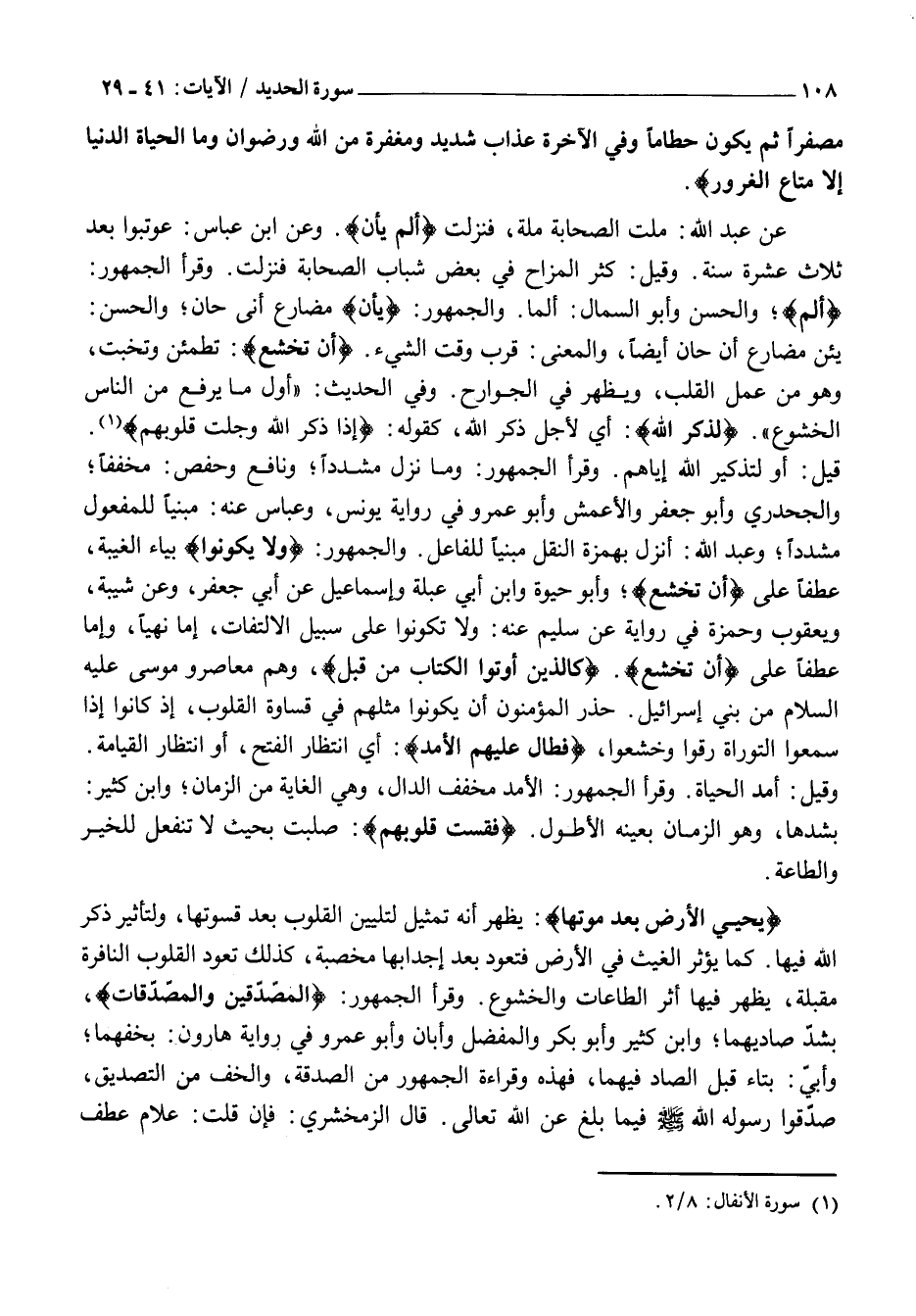 قِيلَ: أَوْ لِتَذْكِيرِ اللَّهِ إِيَّاهُمْ. وَقَرَأَ الْجُمْهُورُ: وَمَا نَزَّلَ مُشَدَّدًا وَنَافِعٌ وَحَفْصٌ: مُخَفَّفًا وَالْجَحْدَرِيُّ وَأَبُو جَعْفَرٍ وَالْأَعْمَشُ وَأَبُو عَمْرٍو فِي رِوَايَةٍ يُونُسَ، وَعَبَّاسٍ عَنْهُ: مَبْنِيًّا لِلْمَفْعُولِ مُشَدَّدًا وَعَبْدُ اللَّهِ: أَنْزَلَ بِهَمْزَةِ النَّقْلِ مَبْنِيًّا لِلْفَاعِلِ. وَالْجُمْهُورُ: وَلا يَكُونُوا بِيَاءِ الْغَيْبَةِ، عَطْفًا عَلَى أَنْ تَخْشَعَ وَأَبُو حَيْوَةَ وَابْنُ أَبِي عبلة وَإِسْمَاعِيلُ عَنْ أَبِي جَعْفَرٍ، وَعَنْ شَيْبَةَ، وَيَعْقُوبَ وَحَمْزَةَ فِي رِوَايَةٍ عَنْ سُلَيْمٍ عَنْهُ: وَلَا تَكُونُوا عَلَى سَبِيلِ الِالْتِفَاتِ، إِمَّا نَهْيًا، وَإِمَّا عَطْفًا عَلَى أَنْ تَخْشَعَ. كَالَّذِينَ أُوتُوا الْكِتابَ مِنْ قَبْلُ، وهم معاصر وموسى عَلَيْهِ السَّلَامُ مِنْ بَنِي إِسْرَائِيلَ. حُذِّرَ الْمُؤْمِنُونَ أَنْ يَكُونُوا مِثْلَهُمْ فِي قَسَاوَةِ الْقُلُوبِ، إِذْ كَانُوا إِذَا سَمِعُوا التَّوْرَاةَ رَقُّوا وَخَشَعُوا، فَطالَ عَلَيْهِمُ الْأَمَدُ: أَيِ انْتِظَارُ الْفَتْحِ، أَوِ انْتِظَارُ الْقِيَامَةِ.