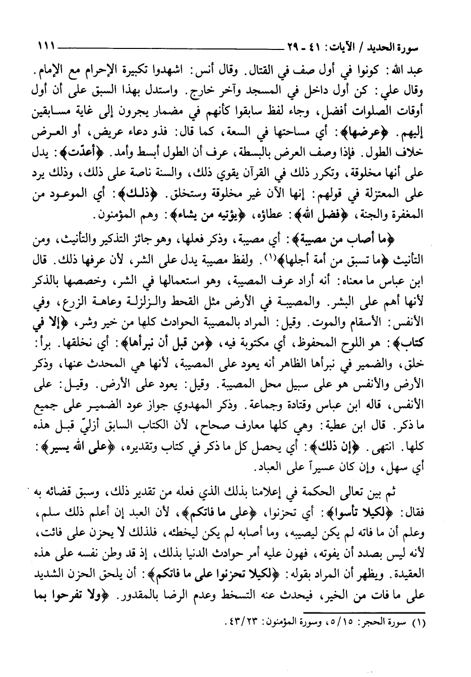 وَاسْتَدَلَّ بِهَذَا السَّبْقِ عَلَى أَنَّ أَوَّلَ أَوْقَاتِ الصَّلَوَاتِ أَفْضَلُ، وَجَاءَ لَفْظُ سَابِقُوا كَأَنَّهُمْ فِي مِضْمَارٍ يَجْرُونَ إِلَى غَايَةٍ مُسَابِقِينَ إِلَيْهِمْ. عَرْضُها: أَيْ مِسَاحَتُهَا فِي السَّعَةِ، كَمَا قَالَ: فَذُو دُعَاءٍ عَرِيضٍ، أَوِ الْعَرْضُ خِلَافُ الطُّولِ. فَإِذَا وُصِفَ الْعَرْضُ بِالْبَسْطَةِ، عُرِفَ أَنَّ الطُّولَ أَبْسَطُ وَأَمَدُّ. أُعِدَّتْ: يَدُلُّ عَلَى أَنَّهَا مَخْلُوقَةٌ، وَتَكَرُّرُ ذَلِكَ فِي الْقُرْآنِ يُقَوِّي ذَلِكَ، وَالسُّنَّةُ نَاصَّةٌ عَلَى ذَلِكَ، وَذَلِكَ يَرُدُّ عَلَى الْمُعْتَزِلَةِ فِي قَوْلِهِمْ: إِنَّهَا الْآنَ غَيْرُ مَخْلُوقَةٍ وَسَتُخْلَقُ. ذلِكَ: أَيِ الْمَوْعُودُ مِنَ الْمَغْفِرَةِ وَالْجَنَّةِ، فَضْلُ اللَّهِ: عَطَاؤُهُ، يُؤْتِيهِ مَنْ يَشاءُ: وَهُمُ الْمُؤْمِنُونَ.
