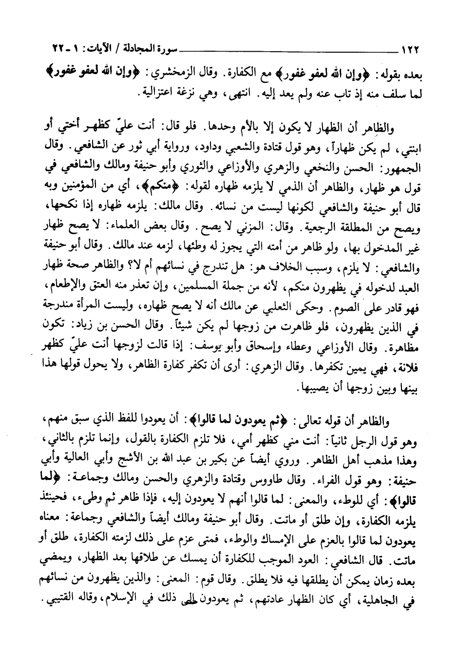 وَالظَّاهِرُ أَنَّ قَوْلَهُ تَعَالَى: ثُمَّ يَعُودُونَ لِما قالُوا: أَنْ يَعُودُوا لِلَفْظِ الَّذِي سَبَقَ مِنْهُمْ، وَهُوَ قَوْلُ الرَّجُلِ ثَانِيًا: أَنْتِ مِنِّي كَظَهْرِ أُمِّي، فَلَا تَلْزَمُ الْكَفَّارَةُ بِالْقَوْلِ، وَإِنَّمَا تَلْزَمُ بِالثَّانِي، وَهَذَا مَذْهَبُ أَهْلِ الظَّاهِرِ. وَرُوِيَ أَيْضًا عَنْ بُكَيْرِ بْنِ عَبْدِ اللَّهِ بْنِ الْأَشَجِّ وَأَبِي الْعَالِيَةِ وَأَبِي حَنِيفَةَ: وَهُوَ قول الفراء. وقال طاووس وَقَتَادَةُ وَالزُّهْرِيُّ وَالْحَسَنُ وَمَالِكٌ وَجَمَاعَةٌ: لِما قالُوا: أَيْ لِلْوَطْءِ، وَالْمَعْنَى: لِمَا قَالُوا أَنَّهُمْ لَا يَعُودُونَ إِلَيْهِ، فَإِذَا ظَاهَرَ ثُمَّ وَطِئَ، فَحِينَئِذٍ يَلْزَمُهُ الْكَفَّارَةُ، وَإِنْ طَلَّقَ أَوْ مَاتَتْ. وَقَالَ أَبُو حَنِيفَةَ وَمَالِكٌ أَيْضًا وَالشَّافِعِيُّ وَجَمَاعَةٌ: مَعْنَاهُ يَعُودُونَ لِمَا قَالُوا بِالْعَزْمِ عَلَى الْإِمْسَاكِ وَالْوَطْءِ، فَمَتَى عَزَمَ عَلَى ذَلِكَ لَزِمَتْهُ الْكَفَّارَةُ، طَلَّقَ أَوْ مَاتَتْ. قَالَ الشَّافِعِيُّ: الْعَوْدُ الْمُوجِبُ لِلْكَفَّارَةِ أَنْ يُمْسِكَ عَنْ طَلَاقِهَا بَعْدَ الظِّهَارِ، وَيَمْضِي بَعْدَهُ زَمَانٌ يُمْكِنُ أَنْ يُطَلِّقَهَا فِيهِ فَلَا يُطَلِّقُ. وَقَالَ قوم: المعنى: والذين يظهرون مِنْ نِسَائِهِمْ فِي الْجَاهِلِيَّةِ، أَيْ كَانَ الظِّهَارُ عَادَتَهُمْ، ثُمَّ يَعُودُونَ إِلَى ذَلِكَ في الإسلام، وقاله القتيبي.