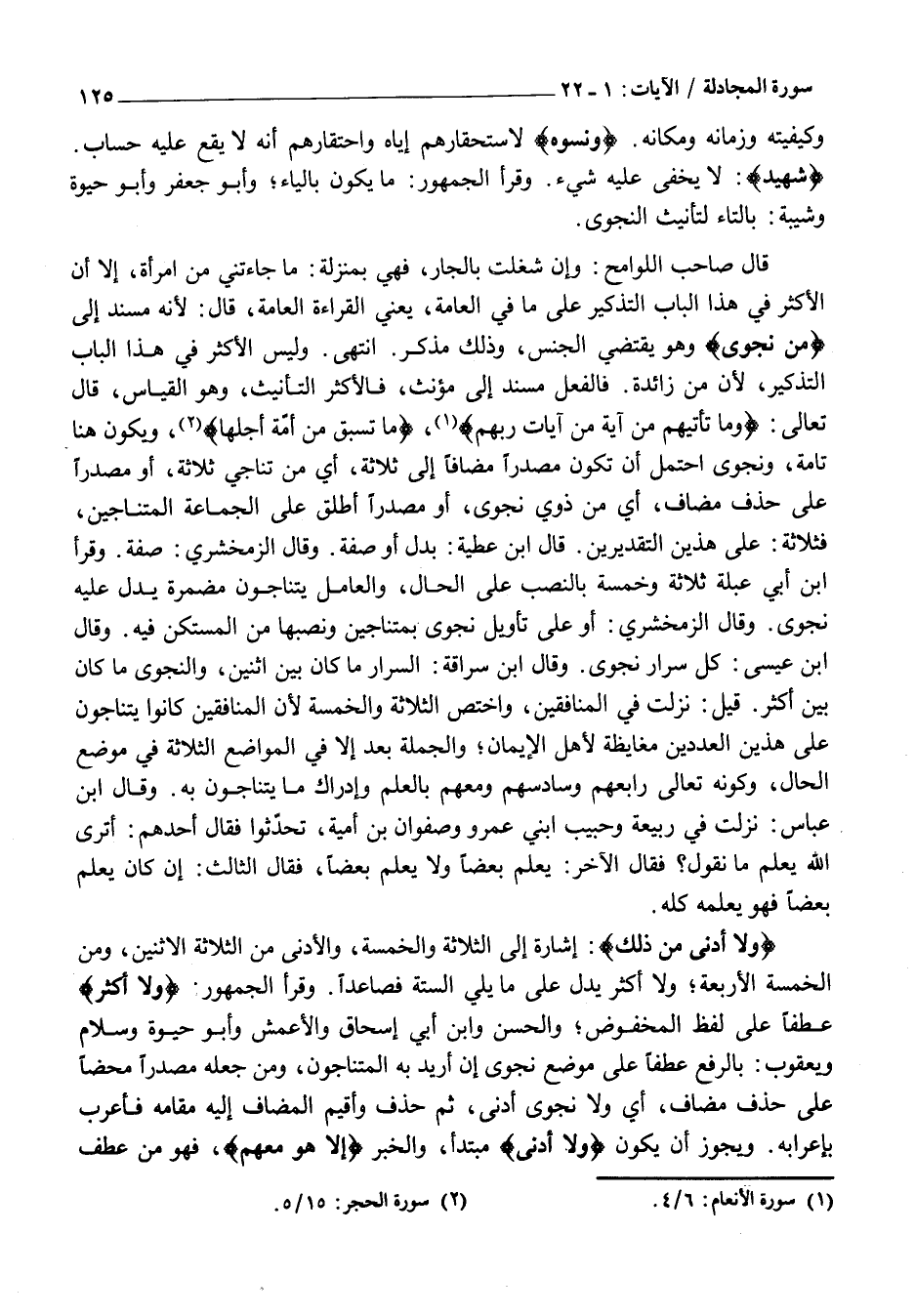 قَالَ صَاحِبُ اللَّوَامِحِ: وَأَنْ شُغِلَتْ بِالْجَارِّ، فَهِيَ بِمَنْزِلَةِ: مَا جَاءَتْنِي مِنِ امْرَأَةٍ، إِلَّا أَنَّ الْأَكْثَرُ فِي هَذَا الْبَابِ التَّذْكِيرُ عَلَى مَا فِي الْعَامَّةِ، يَعْنِي الْقِرَاءَةَ الْعَامَّةَ، قَالَ: لِأَنَّهُ مُسْنَدٌ إِلَى مِنْ نَجْوى وَهُوَ يَقْتَضِي الْجِنْسَ، وَذَلِكَ مُذَكَّرٌ. انْتَهَى. وَلَيْسَ الْأَكْثَرُ فِي هَذَا الْبَابِ التَّذْكِيرَ، لِأَنَّ مِنْ زَائِدَةٌ. فَالْفِعْلُ مُسْنَدٌ إِلَى مُؤَنَّثٍ، فَالْأَكْثَرُ التَّأْنِيثُ، وَهُوَ الْقِيَاسُ، قَالَ تَعَالَى: وَما تَأْتِيهِمْ مِنْ آيَةٍ مِنْ آياتِ رَبِّهِمْ «1» ، مَا تَسْبِقُ مِنْ أُمَّةٍ أَجَلَها «2» ، وَيَكُونُ هُنَا تَامَّةً، وَنَجْوَى احْتَمَلَ أَنْ تَكُونَ مَصْدَرًا مُضَافًا إِلَى ثَلَاثَةٍ، أَيْ مِنْ تَنَاجِي ثَلَاثَةٍ، أَوْ مَصْدَرًا عَلَى حَذْفِ مُضَافٍ، أَيْ مِنْ ذَوِي نَجْوَى، أَوْ مَصْدَرًا أُطْلِقَ عَلَى الْجَمَاعَةِ الْمُتَنَاجِينَ، فَثَلَاثَةٌ: عَلَى هَذَيْنِ التَّقْدِيرَيْنِ. قَالَ ابْنُ عَطِيَّةَ: بَدَلٌ أَوْ صِفَةٌ. وَقَالَ الزَّمَخْشَرِيُّ: صِفَةٌ. وَقَرَأَ ابْنُ أَبِي عَبْلَةَ ثَلَاثَةً وَخَمْسَةً بِالنَّصْبِ عَلَى الْحَالِ، وَالْعَامِلُ يَتَنَاجَوْنَ مُضْمَرَةً يَدُلُّ عَلَيْهِ نَجْوَى. وَقَالَ الزَّمَخْشَرِيُّ: أَوْ عَلَى تَأْوِيلِ نَجْوَى بِمُتَنَاجِينَ وَنَصْبُهَا مِنَ الْمُسْتَكِنِّ فِيهِ. وَقَالَ ابْنُ عِيسَى: كُلُّ سِرَارٍ نَجْوَى. وَقَالَ ابْنُ سُرَاقَةَ: السِّرَارُ مَا كَانَ بَيْنَ اثْنَيْنِ، وَالنَّجْوَى مَا كَانَ بَيْنَ أَكْثَرَ. قِيلَ: نَزَلَتْ فِي الْمُنَافِقِينَ، وَاخْتَصَّ الثَّلَاثَةَ وَالْخَمْسَةَ لِأَنَّ الْمُنَافِقِينَ كَانُوا يَتَنَاجَوْنَ عَلَى هَذَيْنِ الْعَدَدَيْنِ مُغَايَظَةً لِأَهْلِ الْإِيمَانِ وَالْجُمْلَةُ بَعْدَ إِلَّا فِي الْمَوَاضِعِ الثَّلَاثَةِ فِي مَوْضِعِ الْحَالِ، وَكَوْنُهُ تَعَالَى رَابِعَهُمْ وَسَادِسَهُمْ وَمَعَهُمْ بِالْعِلْمِ وَإِدْرَاكِ مَا يَتَنَاجَوْنَ بِهِ. وَقَالَ ابْنُ عَبَّاسٍ: نزلت في رَبِيعَةَ وَحَبِيبٍ ابْنَيْ عَمْرٍو وَصَفْوَانَ بْنِ أُمَيَّةَ، تَحَدَّثُوا فَقَالَ أَحَدُهُمْ: أَتُرَى اللَّهَ يَعْلَمُ مَا نَقُولُ؟ فَقَالَ الْآخَرُ: يَعْلَمُ بَعْضًا وَلَا يَعْلَمُ بَعْضًا، فَقَالَ الثَّالِثُ: إِنْ كَانَ يَعْلَمُ بَعْضًا فَهُوَ يَعْلَمُهُ كُلَّهُ.