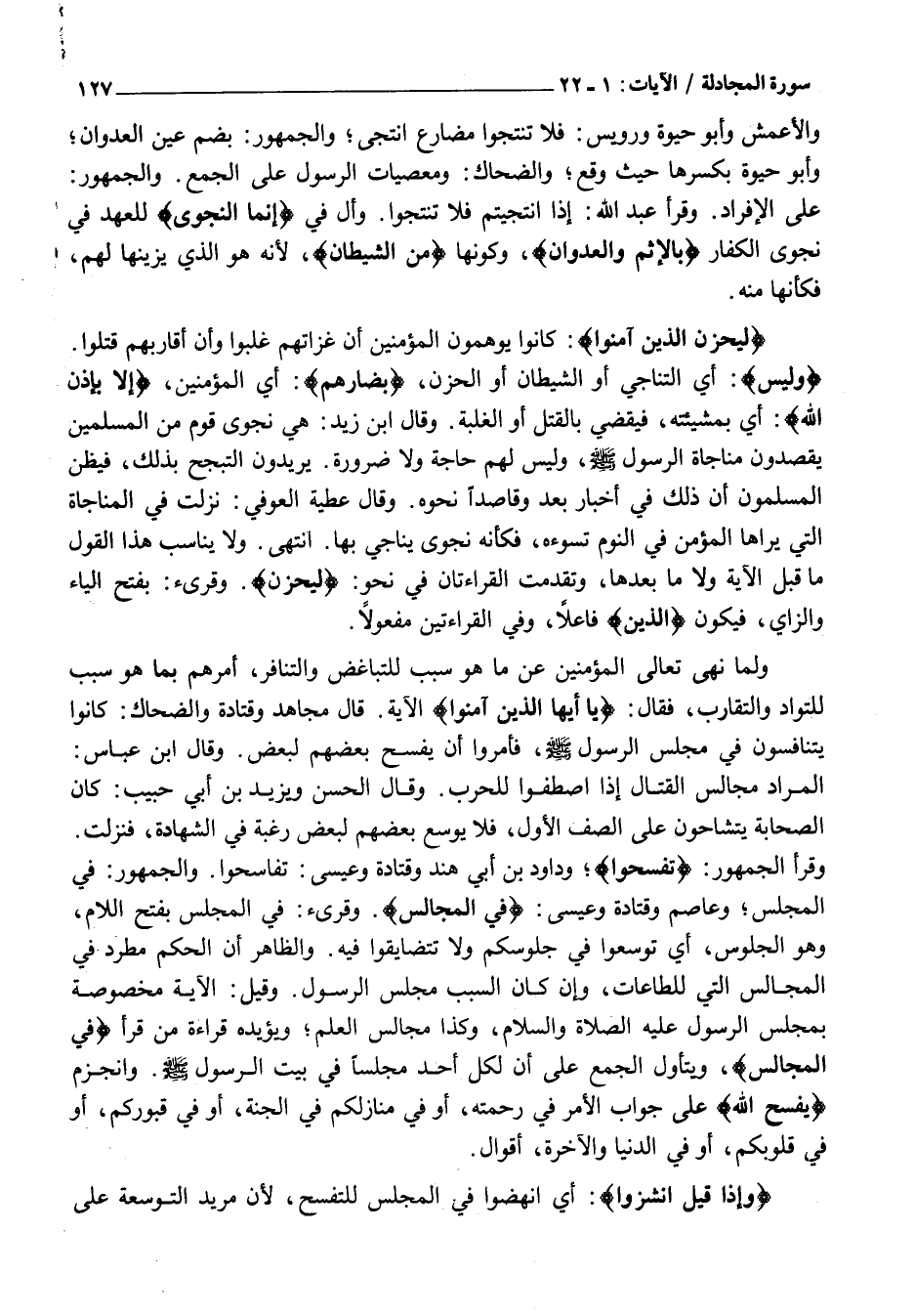 وَقَرَأَ الْجُمْهُورُ: تَفَسَّحُوا وَدَاوُدُ بْنُ أَبِي هِنْدٍ وَقَتَادَةُ وَعِيسَى: تَفَاسَحُوا. وَالْجُمْهُورُ: فِي الْمَجْلِسِ وَعَاصِمٌ وَقَتَادَةُ وَعِيسَى: فِي الْمَجالِسِ. وقرىء: فِي الْمَجْلَسِ بِفَتْحِ اللَّامِ، وَهُوَ الْجُلُوسُ، أَيْ تَوَسَّعُوا فِي جُلُوسِكُمْ وَلَا تَتَضَايَقُوا فِيهِ. وَالظَّاهِرُ أَنَّ الْحُكْمَ مُطَّرِدٌ فِي الْمَجَالِسِ الَّتِي لِلطَّاعَاتِ، وَإِنْ كَانَ السَّبَبُ مَجْلِسَ الرَّسُولِ. وَقِيلَ: الْآيَةُ مَخْصُوصَةٌ بِمَجْلِسِ الرَّسُولِ عَلَيْهِ الصَّلَاةُ وَالسَّلَامُ، وَكَذَا مَجَالِسُ الْعِلْمِ وَيُؤَيِّدُهُ قِرَاءَةُ مَنْ قَرَأَ فِي الْمَجالِسِ، وَيَتَأَوَّلُ الْجَمْعُ عَلَى أَنَّ لِكُلِّ أَحَدٍ مَجْلِسًا فِي بَيْتِ الرسول صلى الله عليه وَسَلَّمَ. وَانْجَزَمَ يَفْسَحِ اللَّهُ عَلَى جَوَابِ الْأَمْرِ فِي رَحْمَتِهِ، أَوْ فِي مَنَازِلِكُمْ فِي الْجَنَّةِ، أَوْ فِي قُبُورِكُمْ، أَوْ فِي قُلُوبِكُمْ، أَوْ فِي الدُّنْيَا وَالْآخِرَةِ، أَقْوَالٌ.