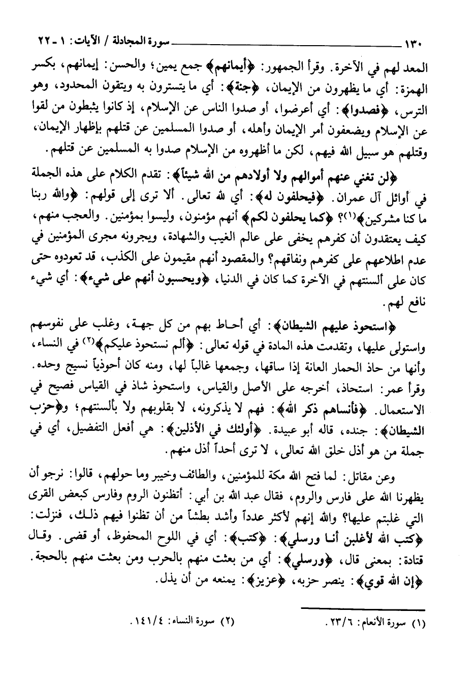 لَنْ تُغْنِيَ عَنْهُمْ أَمْوالُهُمْ وَلا أَوْلادُهُمْ مِنَ اللَّهِ شَيْئاً: تَقَدَّمَ الْكَلَامُ عَلَى هَذِهِ الْجُمْلَةِ فِي أَوَائِلِ آلِ عِمْرَانَ. فَيَحْلِفُونَ لَهُ: أَيْ لِلَّهِ تَعَالَى. أَلَا تَرَى إِلَى قَوْلِهِمْ: وَاللَّهِ رَبِّنا مَا كُنَّا مُشْرِكِينَ «1» ؟ كَما يَحْلِفُونَ لَكُمْ أَنَّهُمْ مُؤْمِنُونَ، وَلَيْسُوا بِمُؤْمِنِينَ. وَالْعَجَبُ مِنْهُمْ، كَيْفَ يَعْتَقِدُونَ أَنَّ كُفْرَهُمْ يَخْفَى عَلَى عَالِمِ الْغَيْبِ وَالشَّهَادَةِ، وَيُجْرُونَهُ مُجْرَى الْمُؤْمِنِينَ فِي عَدَمِ اطِّلَاعِهِمْ عَلَى كُفْرِهِمْ وَنِفَاقِهِمْ؟ وَالْمَقْصُودُ أَنَّهُمْ مُقِيمُونَ عَلَى الْكَذِبِ، قَدْ تَعَوَّدُوهُ حَتَّى كَانَ عَلَى أَلْسِنَتِهِمْ فِي الْآخِرَةِ كَمَا كَانَ فِي الدُّنْيَا، وَيَحْسَبُونَ أَنَّهُمْ عَلى شَيْءٍ: أَيْ شَيْءٍ نَافِعٍ لَهُمْ.