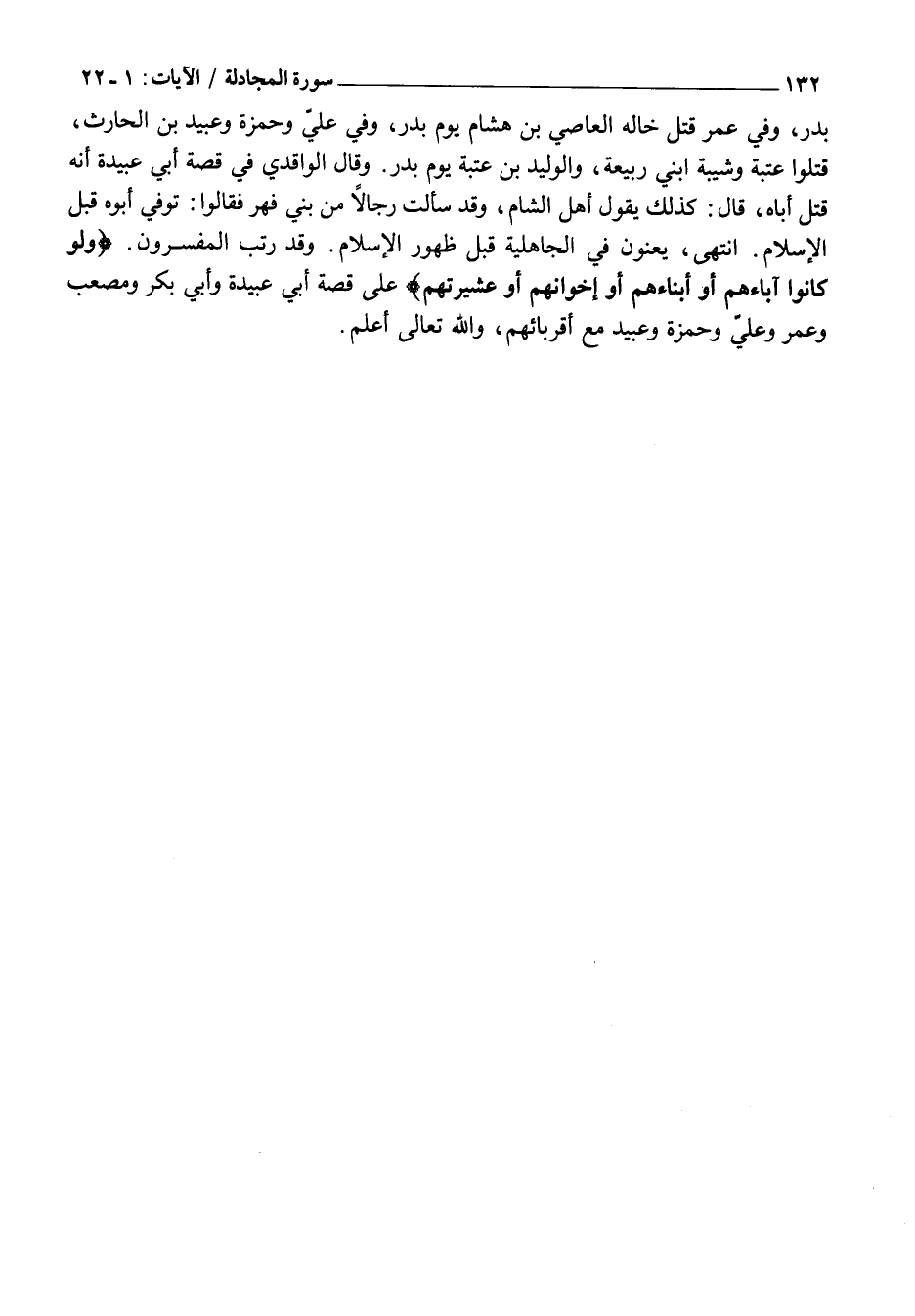 وَقَالَ الْوَاقِدِيُّ فِي قِصَّةِ أَبِي عُبَيْدَةَ أَنَّهُ قَتَلَ أَبَاهُ، قَالَ: كَذَلِكَ يَقُولُ أَهْلُ الشَّامِ، وَقَدْ سَأَلْتُ رِجَالًا مِنْ بَنِي فِهْرٍ فَقَالُوا: تُوُفِّيَ أَبُوهُ قَبْلَ الْإِسْلَامِ. انْتَهَى، يَعْنُونَ فِي الْجَاهِلِيَّةِ قَبْلَ ظُهُورِ الْإِسْلَامِ. وَقَدْ رَتَّبَ الْمُفَسِّرُونَ. وَلَوْ كانُوا آباءَهُمْ أَوْ أَبْناءَهُمْ أَوْ إِخْوانَهُمْ أَوْ عَشِيرَتَهُمْ عَلَى قِصَّةِ أَبِي عُبَيْدَةَ وَأَبِي بَكْرٍ وَمُصْعَبٍ وَعُمَرَ وَعَلِيٍّ وَحَمْزَةَ وَعُبَيْدٍ مَعَ أَقْرِبَائِهِمْ، وَاللَّهُ تَعَالَى أَعْلَمُ.