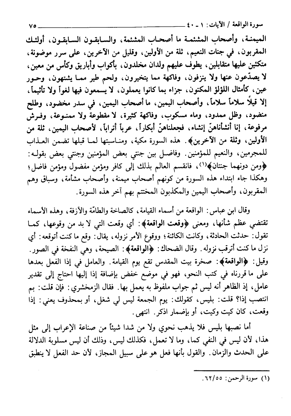 الْمَيْمَنَةِ، وَأَصْحابُ الْمَشْئَمَةِ ما أَصْحابُ الْمَشْئَمَةِ، وَالسَّابِقُونَ السَّابِقُونَ، أُولئِكَ الْمُقَرَّبُونَ، فِي جَنَّاتِ النَّعِيمِ، ثُلَّةٌ مِنَ الْأَوَّلِينَ، وَقَلِيلٌ مِنَ الْآخِرِينَ، عَلى سُرُرٍ مَوْضُونَةٍ، مُتَّكِئِينَ عَلَيْها مُتَقابِلِينَ، يَطُوفُ عَلَيْهِمْ وِلْدانٌ مُخَلَّدُونَ، بِأَكْوابٍ وَأَبارِيقَ وَكَأْسٍ مِنْ مَعِينٍ، لَا يُصَدَّعُونَ عَنْها وَلا يُنْزِفُونَ، وَفاكِهَةٍ مِمَّا يَتَخَيَّرُونَ، وَلَحْمِ طَيْرٍ مِمَّا يَشْتَهُونَ، وَحُورٌ عِينٌ، كَأَمْثالِ اللُّؤْلُؤِ الْمَكْنُونِ، جَزاءً بِما كانُوا يَعْمَلُونَ، لَا يَسْمَعُونَ فِيها لَغْواً وَلا تَأْثِيماً، إِلَّا قِيلًا سَلاماً سَلاماً، وَأَصْحابُ الْيَمِينِ، مَا أَصْحابُ الْيَمِينِ، فِي سِدْرٍ مَخْضُودٍ، وَطَلْحٍ مَنْضُودٍ، وَظِلٍّ مَمْدُودٍ، وَماءٍ مَسْكُوبٍ، وَفاكِهَةٍ كَثِيرَةٍ، لَا مَقْطُوعَةٍ وَلا مَمْنُوعَةٍ، وَفُرُشٍ مَرْفُوعَةٍ، إِنَّا أَنْشَأْناهُنَّ إِنْشاءً، فَجَعَلْناهُنَّ أَبْكاراً، عُرُباً أَتْراباً، لِأَصْحابِ الْيَمِينِ، ثُلَّةٌ مِنَ الْأَوَّلِينَ، وَثُلَّةٌ مِنَ الْآخِرِينَ