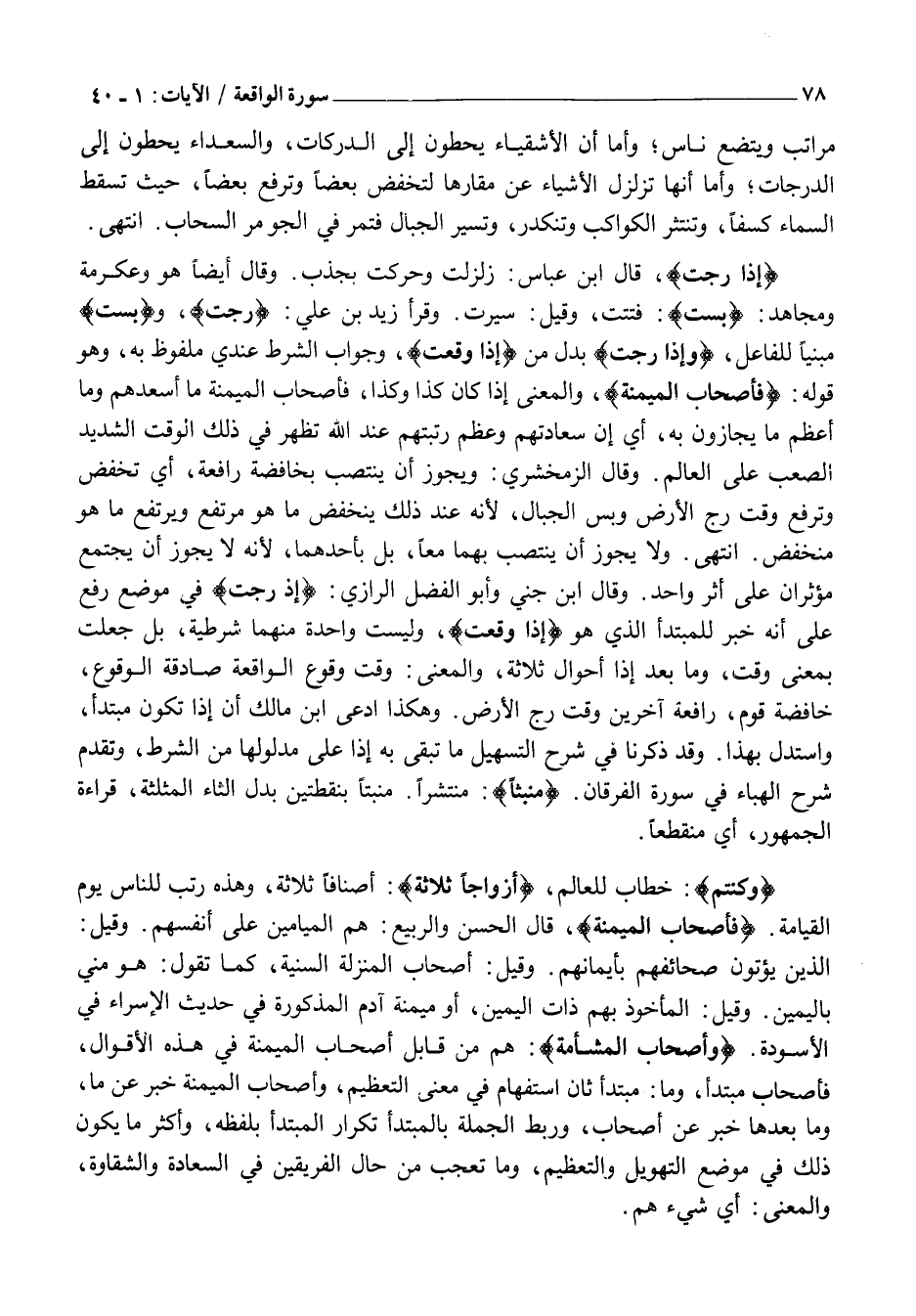 إِذا رُجَّتِ، قَالَ ابْنُ عَبَّاسٍ: زُلْزِلَتْ وَحُرِّكَتْ بِجَذْبٍ. وَقَالَ أَيْضًا هُوَ وَعِكْرِمَةُ وَمُجَاهِدٌ: بُسَّتِ: فُتِّتَتْ، وَقِيلَ: سُيِّرَتْ. وَقَرَأَ زَيْدُ بْنُ عَلِيٍّ: رُجَّتِ، وبُسَّتِ مبنيا للفاعل، وإِذا رُجَّتِ بَدَلٌ مِنْ إِذا وَقَعَتِ، وَجَوَابُ الشَّرْطِ عِنْدِي مَلْفُوظٌ بِهِ، وَهُوَ قَوْلُهُ: فَأَصْحابُ الْمَيْمَنَةِ، وَالْمَعْنَى إِذَا كَانَ كَذَا وَكَذَا، فَأَصْحَابُ الْمَيْمَنَةِ مَا أَسْعَدَهُمْ وَمَا أَعْظَمَ مَا يُجَازَوْنَ بِهِ، أَيْ إِنَّ سَعَادَتَهُمْ وَعِظَمَ رُتْبَتِهِمْ عِنْدَ اللَّهِ تَظْهَرُ فِي ذَلِكَ الْوَقْتِ الشَّدِيدِ الصَّعْبِ عَلَى الْعَالَمِ. وَقَالَ الزَّمَخْشَرِيُّ: وَيَجُوزُ أَنْ يَنْتَصِبَ بِخَافِضَةٍ رَافِعَةٍ، أَيْ تَخْفِضُ وَتَرْفَعُ وَقْتَ رَجِّ الْأَرْضِ وَبَسِّ الْجِبَالِ، لِأَنَّهُ عِنْدَ ذَلِكَ يَنْخَفِضُ مَا هُوَ مُرْتَفِعٌ وَيَرْتَفِعُ مَا هُوَ مُنْخَفِضٌ. انْتَهَى. وَلَا يَجُوزُ أَنْ يَنْتَصِبَ بِهِمَا مَعًا، بَلْ بِأَحَدِهِمَا، لِأَنَّهُ لَا يَجُوزُ أَنْ يَجْتَمِعَ مُؤَثِّرَانِ عَلَى أَثَرٍ وَاحِدٍ. وَقَالَ ابْنُ جِنِّي وَأَبُو الْفَضْلِ الرَّازِيُّ: إِذا رُجَّتِ فِي مَوْضِعِ رَفْعٍ عَلَى أَنَّهُ خَبَرٌ لِلْمُبْتَدَأِ الَّذِي هُوَ إِذا وَقَعَتِ، وَلَيْسَتْ وَاحِدَةٌ مِنْهُمَا شُرْطِيَّةً، بَلْ جُعِلَتْ بِمَعْنَى وَقْتٍ، وَمَا بَعْدَ إِذَا أَحْوَالٌ ثَلَاثَةٌ، وَالْمَعْنَى: وَقْتُ وُقُوعِ الْوَاقِعَةِ صَادِقَةَ الْوُقُوعِ، خَافِضَةَ قَوْمٍ، رَافِعَةَ آخَرِينَ وَقْتُ رَجِّ الْأَرْضِ. وَهَكَذَا ادَّعَى ابْنُ مَالِكٍ أَنَّ إِذَا تَكُونُ مُبْتَدَأً، وَاسْتَدَلَّ بِهَذَا. وَقَدْ ذَكَرْنَا فِي شَرْحِ التَّسْهِيلِ مَا تَبْقَى بِهِ إِذَا عَلَى مَدْلُولِهَا مِنَ الشَّرْطِ، وَتَقَدَّمَ شَرْحُ الْهَبَاءِ فِي سُورَةِ الْفُرْقَانِ. مُنْبَثًّا: مُنْتَشِرًا. مُنْبَتًّا بِنُقْطَتَيْنِ بَدَلَ الثَّاءِ الْمُثَلَّثَةِ، قِرَاءَةُ الْجُمْهُورِ، أَيْ مُنْقَطِعًا.