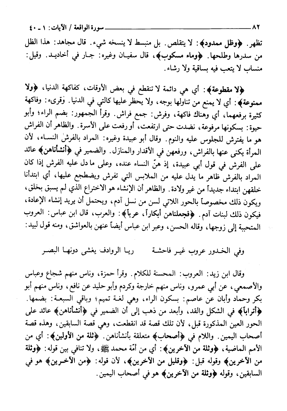 أَتْراباً فِي الشَّكْلِ وَالْقَدِّ، وَأَبْعَدَ مَنْ ذَهَبَ إِلَى أَنَّ الضَّمِيرَ فِي أَنْشَأْناهُنَّ عَائِدٌ عَلَى الْحُورِ الْعِينِ الْمَذْكُورَةِ قَبْلُ، لِأَنَّ تِلْكَ قِصَّةٌ قَدِ انْقَطَعَتْ، وَهِيَ قِصَّةُ السَّابِقِينَ، وَهَذِهِ قِصَّةُ أَصْحَابِ الْيَمِينِ. وَاللَّامُ فِي لِأَصْحابِ مُتَعَلِّقَةٌ بِأَنْشَأْنَاهُنَّ. ثُلَّةٌ مِنَ الْأَوَّلِينَ: أَيْ مِنَ الْأُمَمِ الْمَاضِيَةِ، وَثُلَّةٌ مِنَ الْآخِرِينَ: أَيْ مِنْ أُمَّةِ مُحَمَّدٍ صَلَّى اللَّهُ عَلَيْهِ وَسَلَّمَ، وَلَا تَنَافِيَ بَيْنَ قَوْلِهِ: وَثُلَّةٌ مِنَ الْآخِرِينَ وَقَوْلِهِ قَبْلُ: وَقَلِيلٌ مِنَ الْآخِرِينَ، لِأَنَّ قَوْلَهُ: مِنَ الْآخِرِينَ هُوَ فِي السَّابِقِينَ، وَقَوْلَهُ وَثُلَّةٌ مِنَ الْآخِرِينَ هُوَ فِي أصحاب اليمين.