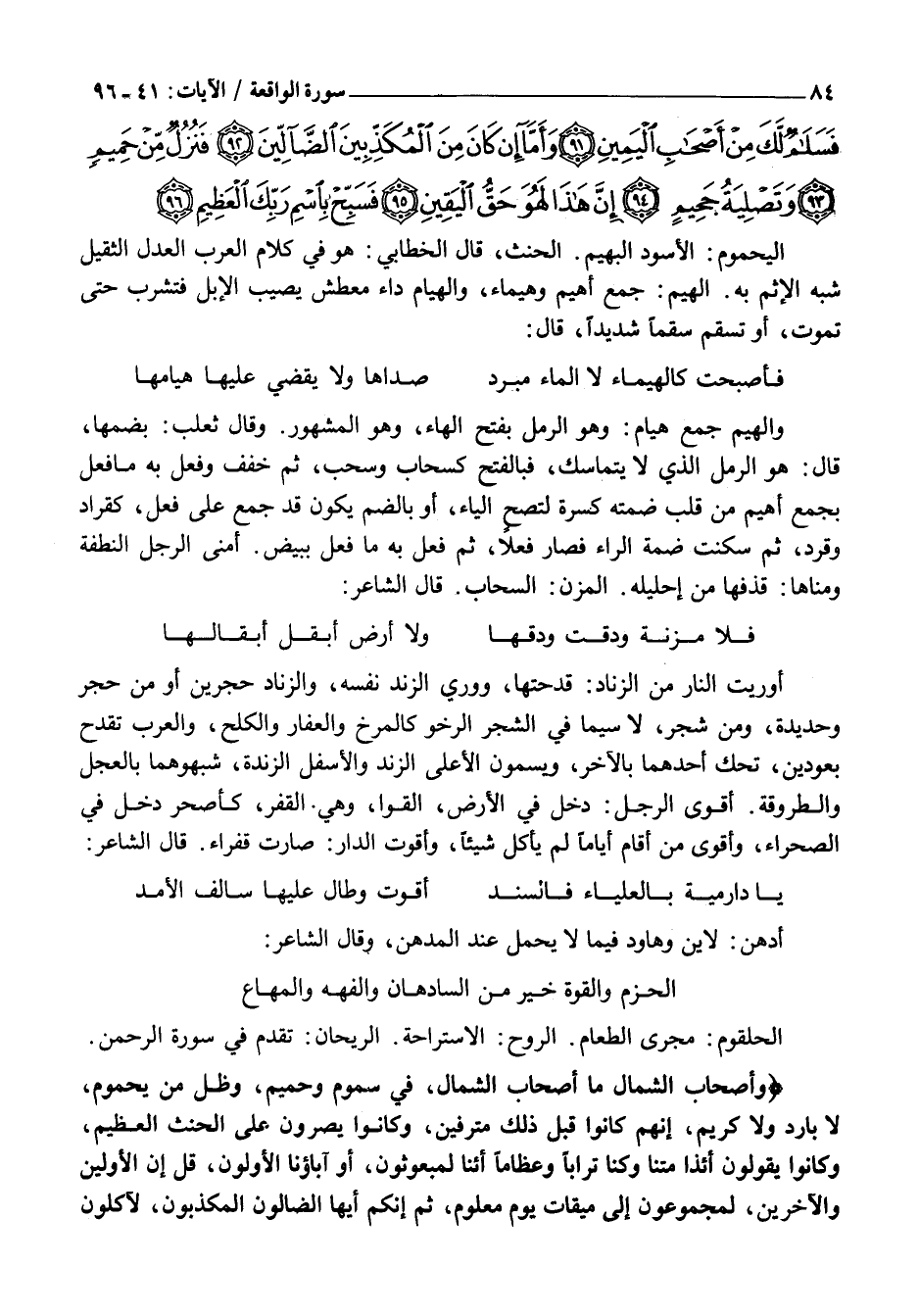 الْحَزْمُ وَالْقُوَّةُ خَيْرٌ من السادهان والفهه والمهاع الْحُلْقُومُ: مَجْرَى الطَّعَامِ. الرُّوحُ: الِاسْتِرَاحَةُ. الرَّيْحَانُ: تَقَدَّمَ فِي سُورَةِ الرَّحْمَنِ.