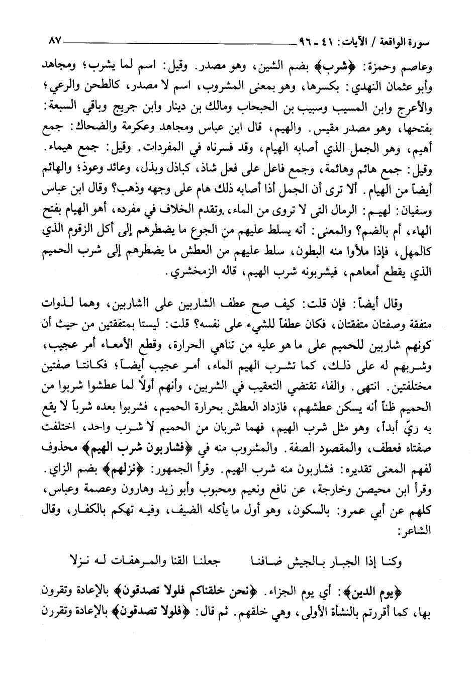 وَقَالَ أَيْضًا: فَإِنْ قُلْتَ: كَيْفَ صَحَّ عَطْفُ الشَّارِبِينَ عَلَى الشَّارِبِينَ، وَهُمَا لِذَوَاتٍ مُتَّفِقَةٍ وَصِفَتَانِ مُتَّفِقَتَانِ، فَكَانَ عَطْفًا لِلشَّيْءِ عَلَى نَفْسِهِ؟ قُلْتُ: لَيْسَتَا بِمُتَّفِقَتَيْنِ مِنْ حَيْثُ أَنَّ كَوْنَهُمْ شَارِبِينَ لِلْحَمِيمِ عَلَى مَا هُوَ عَلَيْهِ مِنْ تَنَاهِي الْحَرَارَةِ، وَقَطْعِ الْأَمْعَاءِ أَمْرٌ عَجِيبٌ، وَشُرْبَهُمْ لَهُ عَلَى ذَلِكَ، كَمَا تَشْرَبُ الْهِيمُ الْمَاءَ، أَمْرٌ عَجِيبٌ أَيْضًا فَكَانَتَا صِفَتَيْنِ مُخْتَلِفَتَيْنِ. انْتَهَى. وَالْفَاءُ تَقْتَضِي التَّعْقِيبَ فِي الشُّرْبَيْنِ، وَأَنَّهُمْ أَوَّلًا لَمَّا عَطِشُوا شَرِبُوا مِنَ الْحَمِيمِ ظَنًّا أَنَّهُ يُسَكِّنُ عَطَشَهُمْ، فَازْدَادَ الْعَطَشُ بِحَرَارَةِ الْحَمِيمِ، فَشَرِبُوا بَعْدَهُ شُرْبًا لَا يَقَعُ بِهِ رَيٌّ أَبَدًا، وَهُوَ مِثْلُ شُرْبِ الْهِيمِ، فَهُمَا شُرْبَانِ مِنَ الْحَمِيمِ لَا شُرْبٌ وَاحِدٌ، اخْتَلَفَتْ صِفَتَاهُ فَعُطِفَ، وَالْمَقْصُودُ الصِّفَةُ. وَالْمَشْرُوبُ مِنْهُ فِي فَشارِبُونَ شُرْبَ الْهِيمِ مَحْذُوفٌ لِفَهْمِ الْمَعْنَى تَقْدِيرُهُ: فَشَارِبُونَ مِنْهُ شُرْبَ الْهِيمِ. وَقَرَأَ الْجُمْهُورُ: نُزُلُهُمْ بِضَمِّ الزَّايِ.