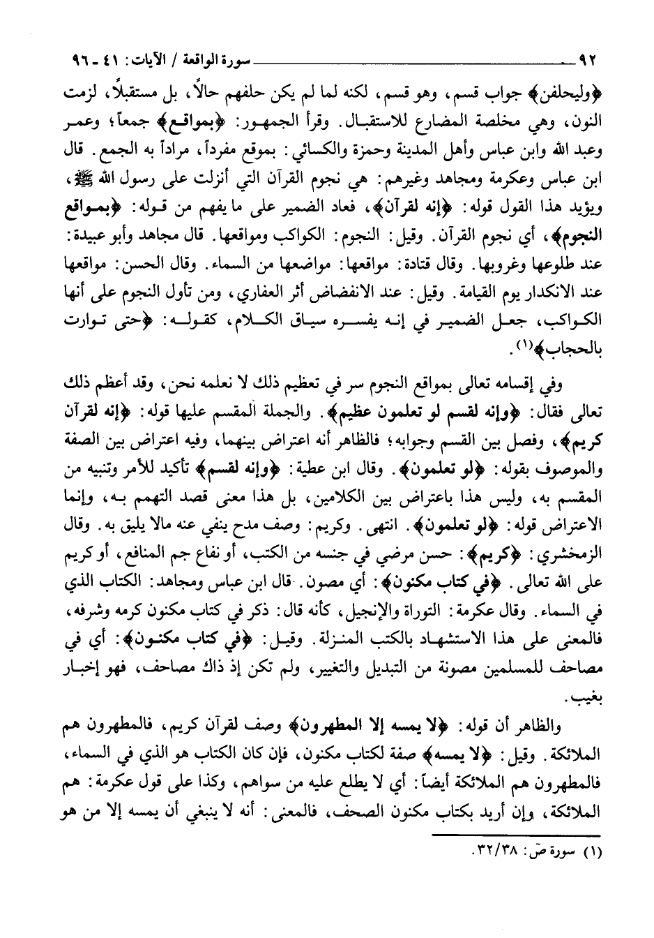 وَفِي إِقْسَامِهِ تَعَالَى بِمَوَاقِعِ النُّجُومِ سِرٌّ فِي تَعْظِيمِ ذَلِكَ لَا نَعْلَمُهُ نَحْنُ، وَقَدْ أَعْظَمَ ذَلِكَ تَعَالَى فَقَالَ: وَإِنَّهُ لَقَسَمٌ لَوْ تَعْلَمُونَ عَظِيمٌ. وَالْجُمْلَةُ الْمُقْسَمُ عَلَيْهَا قَوْلُهُ: إِنَّهُ لَقُرْآنٌ كَرِيمٌ، وَفَصَلَ بَيْنَ الْقَسَمِ وَجَوَابِهِ فَالظَّاهِرُ أَنَّهُ اعْتِرَاضٌ بَيْنَهُمَا، وَفِيهِ اعْتِرَاضٌ بَيْنَ الصِّفَةِ وَالْمَوْصُوفِ بِقَوْلِهِ: لَوْ تَعْلَمُونَ. وَقَالَ ابْنُ عَطِيَّةَ: وَإِنَّهُ لَقَسَمٌ تَأْكِيدٌ لِلْأَمْرِ وَتَنْبِيهٌ مِنَ الْمُقْسَمِ بِهِ، وَلَيْسَ هَذَا بِاعْتِرَاضٍ بَيْنَ الْكَلَامَيْنِ، بَلْ هَذَا مَعْنًى قُصِدَ التَّهَمُّمِ بِهِ، وَإِنَّمَا الِاعْتِرَاضُ قَوْلُهُ: لَوْ تَعْلَمُونَ. انْتَهَى. وَكَرِيمٌ: وَصْفُ مَدْحٍ يَنْفِي عنه مالا يَلِيقُ بِهِ. وَقَالَ الزَّمَخْشَرِيُّ: كَرِيمٌ: حَسَنٌ مُرْضِيٌّ فِي جِنْسِهِ مِنَ الْكُتُبِ، أَوْ نَفَّاعٌ جَمُّ الْمَنَافِعِ، أَوْ كَرِيمٌ عَلَى اللَّهِ تَعَالَى. فِي كِتابٍ مَكْنُونٍ: أَيْ مَصُونٍ. قَالَ ابْنُ عَبَّاسٍ وَمُجَاهِدٌ: الْكِتَابُ الَّذِي فِي السَّمَاءِ. وَقَالَ عِكْرِمَةُ: التَّوْرَاةُ وَالْإِنْجِيلُ، كَأَنَّهُ قَالَ: ذُكِرَ فِي كِتَابٍ مَكْنُونٍ كَرَمُهُ وَشَرَفُهُ، فَالْمَعْنَى عَلَى هَذَا الِاسْتِشْهَادِ بِالْكُتُبِ الْمُنَزَّلَةِ. وَقِيلَ: فِي كِتابٍ مَكْنُونٍ: أَيْ فِي مَصَاحِفَ لِلْمُسْلِمِينَ مَصُونَةٍ مِنَ التَّبْدِيلِ وَالتَّغْيِيرِ، وَلَمْ تَكُنْ إِذْ ذَاكَ مَصَاحِفُ، فَهُوَ إِخْبَارٌ بِغَيْبٍ.