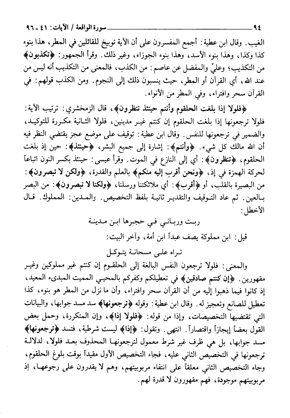 تَرَاهُ عَلَى مَسْحَانَةٍ يَتَوَكَّلُ وَالْمَعْنَى: فَلَوْلَا تَرْجِعُونَ النَّفْسَ الْبَالِغَةَ إِلَى الحلقوم إن كنتم غير مَمْلُوكِينَ وَغَيْرَ مَقْهُورِينَ. إِنْ كُنْتُمْ صادِقِينَ فِي تَعْطِيلِكُمْ وَكُفْرِكُمْ بِالْمُحْيِي الْمُمِيتِ الْمُبْدِئِ الْمُعِيدِ، إِذْ كَانُوا فِيمَا ذَهَبُوا إِلَيْهِ مِنْ أَنَّ الْقُرْآنَ سِحْرٌ وَافْتِرَاءٌ، وَأَنَّ مَا نَزَلَ مِنَ الْمَطَرِ هُوَ بِنَوْءِ، كَذَا تَعْطِيلٌ لِلصَّانِعِ وَتَعْجِيزٌ لَهُ. وَقَالَ ابْنُ عَطِيَّةَ: وقوله تَرْجِعُونَها سَدَّ مَسَدَّ جَوَابِهَا، وَالْبَيَانَاتُ الَّتِي تَقْتَضِيهَا التَّخْصِيصَاتُ، وَإِذَا مِنْ قَوْلِهِ: فَلَوْلا إِذا، وإن الْمُتَكَرِّرَةُ، وَحَمَلَ بَعْضُ الْقَوْلِ بَعْضًا إِيجَازًا وَاقْتِصَارًا. انْتَهَى. وَتَقُولُ: إِذا لَيْسَتْ شَرْطِيَّةً، فَتَسُدُّ تَرْجِعُونَها مَسَدَّ جَوَابِهَا، بَلْ هِيَ ظَرْفٌ غَيْرُ شَرْطٍ مَعْمُولٌ لِتَرْجِعُونَهَا الْمَحْذُوفِ بَعْدَ فَلَوْلَا، لِدَلَالَةِ تَرْجِعُونَهَا فِي التَّخْصِيصِ الثَّانِي عَلَيْهِ، فَجَاءَ التَّخْصِيصُ الْأَوَّلُ مُقَيَّدًا بِوَقْتِ بُلُوغِ الْحُلْقُومِ، وَجَاءَ التَّخْصِيصُ الثَّانِي مُعَلَّقًا عَلَى انْتِفَاءِ مَرْبُوبِيَّتِهِمْ، وَهُمْ لَا يَقْدِرُونَ عَلَى رُجُوعِهَا، إِذْ مَرْبُوبِيَّتِهِمْ مَوْجُودَةٌ، فَهُمْ مَقْهُورُونَ لَا قُدْرَةَ لَهُمْ.