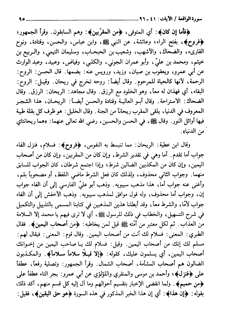 وَقَالَ ابْنُ عَطِيَّةَ: الرَّيْحَانُ: مِمَّا تَنْبَسِطُ بِهِ النُّفُوسُ، فَرَوْحٌ: فَسَلَامٌ، فَنُزُلٌ الْفَاءُ جَوَابُ أَمَّا تَقَدَّمَ. أَمَّا وَهِيَ فِي تَقْدِيرِ الشَّرْطِ، وَإِنْ كَانَ مِنْ الْمُقَرَّبِينَ، وَإِنْ كَانَ مِنْ أَصْحَابِ الْيَمِينِ، وَإِنْ كَانَ مِنَ الْمُكَذِّبِينَ الضَّالِّينَ شَرْطٌ وَإِذَا اجْتَمَعَ شَرْطَانِ، كَانَ الْجَوَابُ لِلسَّابِقِ مِنْهُمَا. وَجَوَابُ الثَّانِي مَحْذُوفٌ، وَلِذَلِكَ كَانَ فِعْلُ الشَّرْطِ مَاضِيَ اللَّفْظِ، أَوْ مَصْحُوبًا بِلَمْ، وَأَغْنَى عَنْهُ جَوَابُ أَمَّا، هَذَا مَذْهَبُ سِيبَوَيْهِ. وَذَهَبَ أَبُو عَلِيٍّ الْفَارِسِيُّ إِلَى أَنَّ الْفَاءَ جَوَابُ إِنْ، وَجَوَابُ أَمَّا مَحْذُوفٌ، وَلَهُ قَوْلٌ مُوَافِقٌ لِمَذْهَبِ سِيبَوَيْهِ. وَذَهَبَ الْأَخْفَشُ إِلَى أَنَّ الفاء جواب لَأَمَّا، وَالشَّرْطِ مَعًا، وَقَدْ أَبْطَلْنَا هَذَيْنِ الْمَذْهَبَيْنِ فِي كِتَابِنَا الْمُسَمَّى بِالتَّذْيِيلِ وَالتَّكْمِيلِ فِي شَرْحِ التَّسْهِيلِ، وَالْخِطَابُ فِي ذَلِكَ لِلرَّسُولِ صَلَّى اللَّهُ عَلَيْهِ وَسَلَّمَ، أي لَا تَرَى فِيهِمْ يَا مُحَمَّدُ إِلَّا السَّلَامَةَ مِنَ الْعَذَابِ. ثُمَّ لِكُلِّ مُعْتَبِرٍ مِنْ أُمَّتِهِ صَلَّى اللَّهُ عَلَيْهِ وَسَلَّمَ قيل لِمَنْ يُخَاطِبُهُ: مِنْ أَصْحابِ الْيَمِينِ. فَقَالَ الطَّبَرِيُّ: الْمَعْنَى: فَسَلَامٌ لَكَ أَنْتَ مِنْ أَصْحَابِ الْيَمِينِ. وَقَالَ قَوْمٌ: الْمَعْنَى: فَيُقَالُ لَهُمْ:
