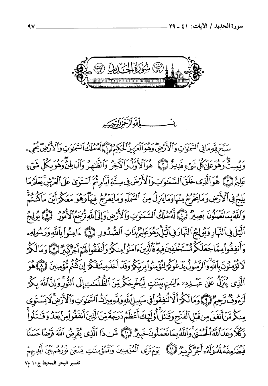 سَبَّحَ لِلَّهِ مَا فِي السَّماواتِ وَالْأَرْضِ وَهُوَ الْعَزِيزُ الْحَكِيمُ (1) لَهُ مُلْكُ السَّماواتِ وَالْأَرْضِ يُحْيِي وَيُمِيتُ وَهُوَ عَلى كُلِّ شَيْءٍ قَدِيرٌ (2) هُوَ الْأَوَّلُ وَالْآخِرُ وَالظَّاهِرُ وَالْباطِنُ وَهُوَ بِكُلِّ شَيْءٍ عَلِيمٌ (3) هُوَ الَّذِي خَلَقَ السَّماواتِ وَالْأَرْضَ فِي سِتَّةِ أَيَّامٍ ثُمَّ اسْتَوى عَلَى الْعَرْشِ يَعْلَمُ مَا يَلِجُ فِي الْأَرْضِ وَما يَخْرُجُ مِنْها وَما يَنْزِلُ مِنَ السَّماءِ وَما يَعْرُجُ فِيها وَهُوَ مَعَكُمْ أَيْنَ مَا كُنْتُمْ وَاللَّهُ بِما تَعْمَلُونَ بَصِيرٌ (4)