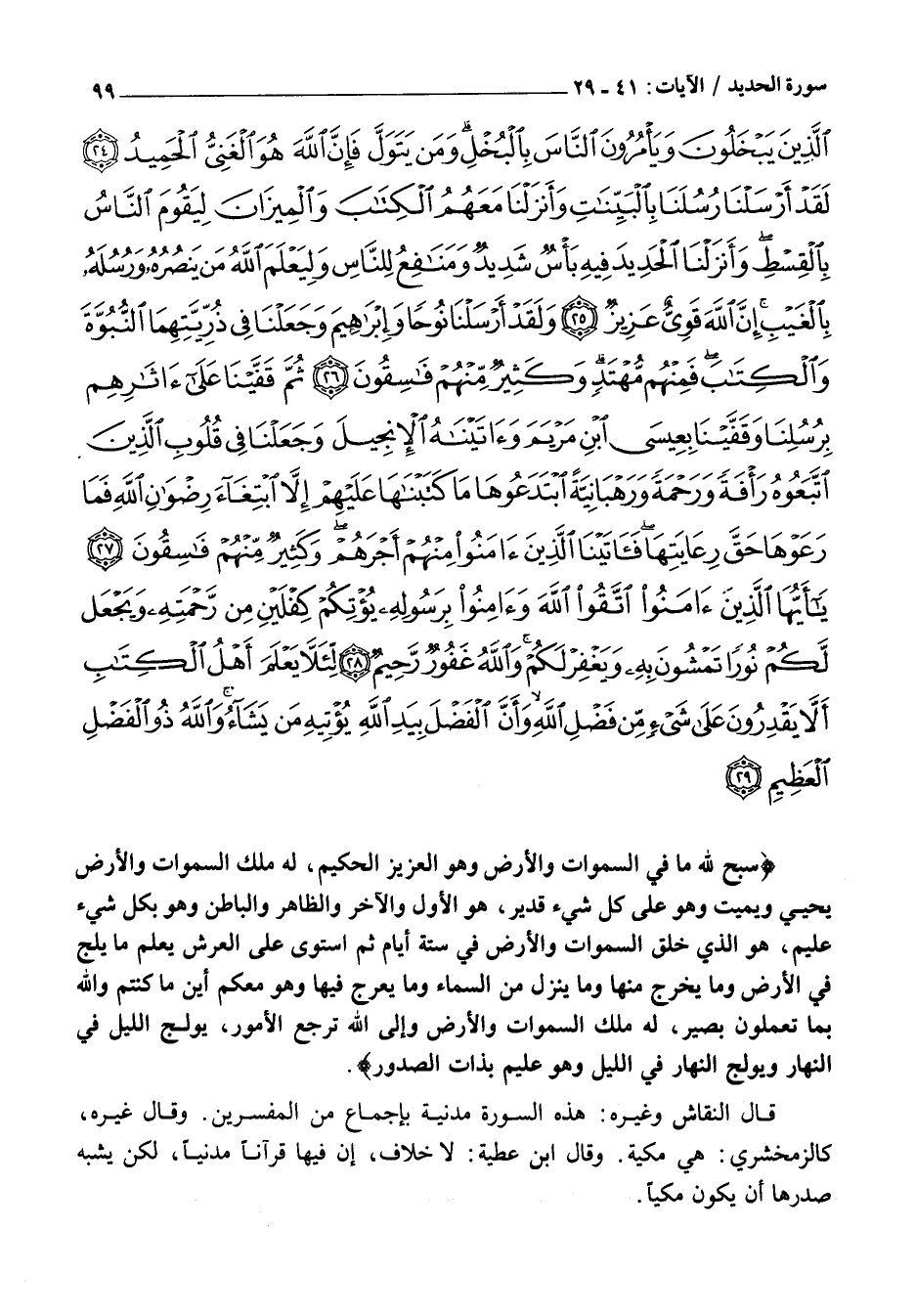 سَبَّحَ لِلَّهِ مَا فِي السَّماواتِ وَالْأَرْضِ وَهُوَ الْعَزِيزُ الْحَكِيمُ، لَهُ مُلْكُ السَّماواتِ وَالْأَرْضِ يُحْيِي وَيُمِيتُ وَهُوَ عَلى كُلِّ شَيْءٍ قَدِيرٌ، هُوَ الْأَوَّلُ وَالْآخِرُ وَالظَّاهِرُ وَالْباطِنُ وَهُوَ بِكُلِّ شَيْءٍ عَلِيمٌ، هُوَ الَّذِي خَلَقَ السَّماواتِ وَالْأَرْضَ فِي سِتَّةِ أَيَّامٍ ثُمَّ اسْتَوى عَلَى الْعَرْشِ يَعْلَمُ مَا يَلِجُ فِي الْأَرْضِ وَما يَخْرُجُ مِنْها وَما يَنْزِلُ مِنَ السَّماءِ وَما يَعْرُجُ فِيها وَهُوَ مَعَكُمْ أَيْنَ مَا كُنْتُمْ وَاللَّهُ بِما تَعْمَلُونَ بَصِيرٌ، لَهُ مُلْكُ السَّماواتِ وَالْأَرْضِ وَإِلَى اللَّهِ تُرْجَعُ الْأُمُورُ، يُولِجُ اللَّيْلَ فِي النَّهارِ وَيُولِجُ النَّهارَ فِي اللَّيْلِ وَهُوَ عَلِيمٌ بِذاتِ الصُّدُورِ.