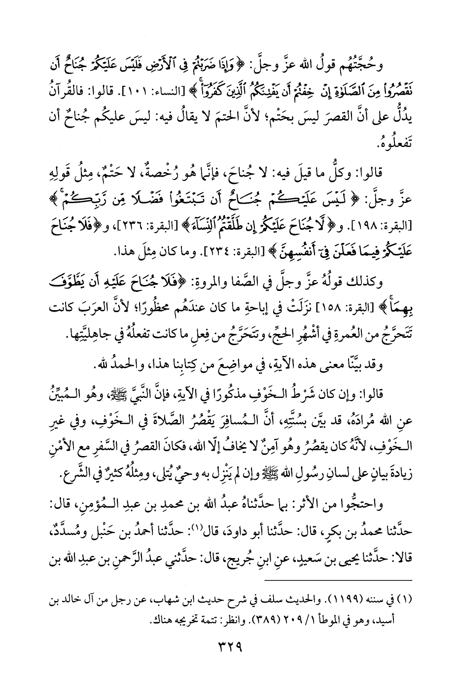 وحُجَّتُهُم قولُ اللَّه عزَّ وجلَّ: {وَإِذَا ضَرَبْتُمْ فِي الْأَرْضِ فَلَيْسَ عَلَيْكُمْ جُنَاحٌ أَنْ تَقْصُرُوا مِنَ الصَّلَاةِ إِنْ خِفْتُمْ أَنْ يَفْتِنَكُمُ الَّذِينَ كَفَرُوا} [النساء: ١٠١]. قالوا: فالقُرآنُ يدُلُّ على أنَّ القصرَ ليسَ بحَتْم؛ لأنَّ الحتمَ لا يقالُ فيه: ليسَ عليكُم جُناحٌ أن تَفعلُوهُ.