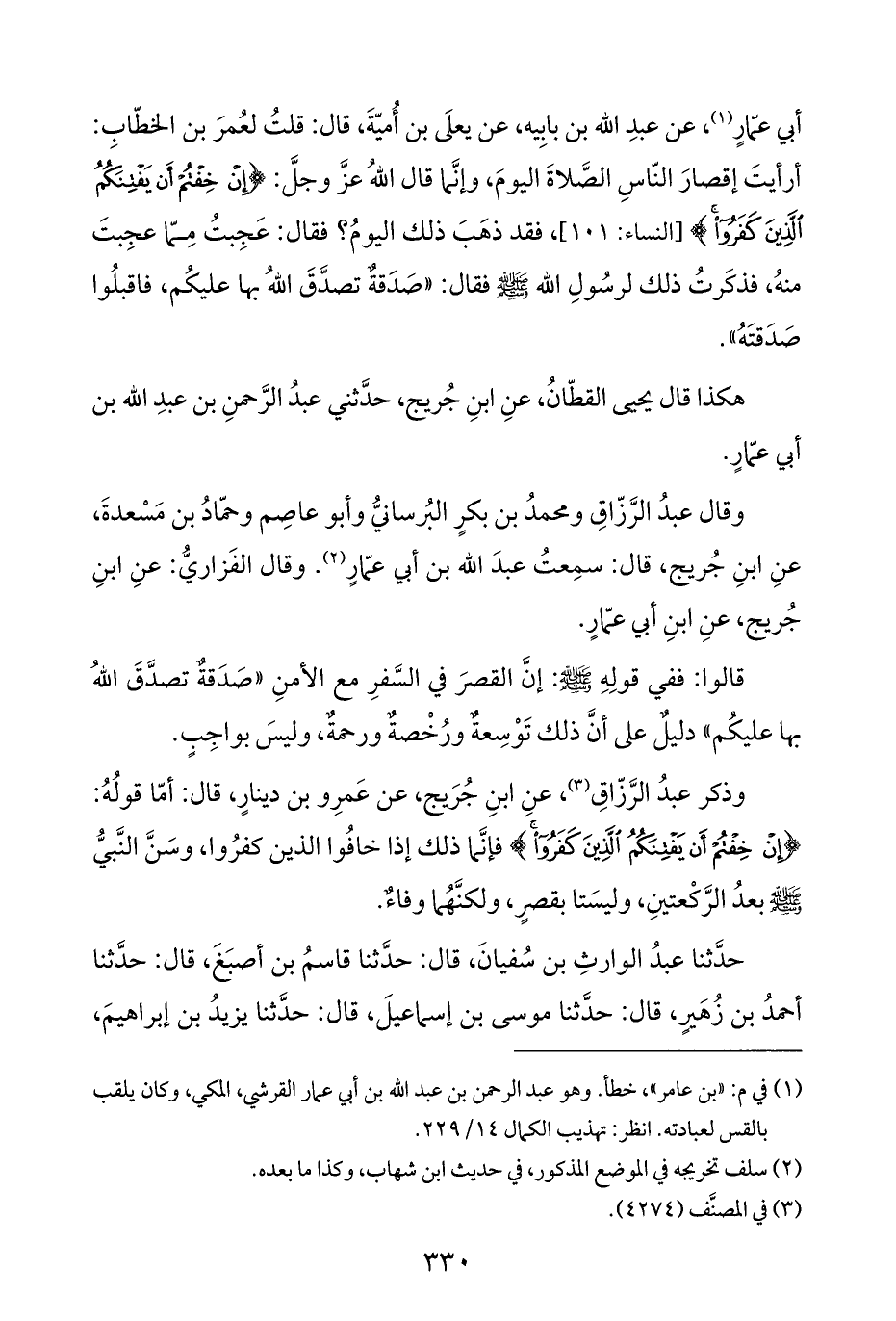 وذكر عبدُ الرَّزّاقِ (¬٣)، عنِ ابنِ جُرَيج، عن عَمرِو بن دينارٍ، قال: أمّا قولُهُ: {إِنْ خِفْتُمْ أَنْ يَفْتِنَكُمُ الَّذِينَ كَفَرُوا} فإنَّما ذلك إذا خافُوا الذين كفرُوا، وسَنَّ النَّبيُّ -صلى اللَّه عليه وسلم- بعدُ الرَّكْعتينِ، وليسَتا بقصرٍ، ولكنَّهُما وفاءٌ.