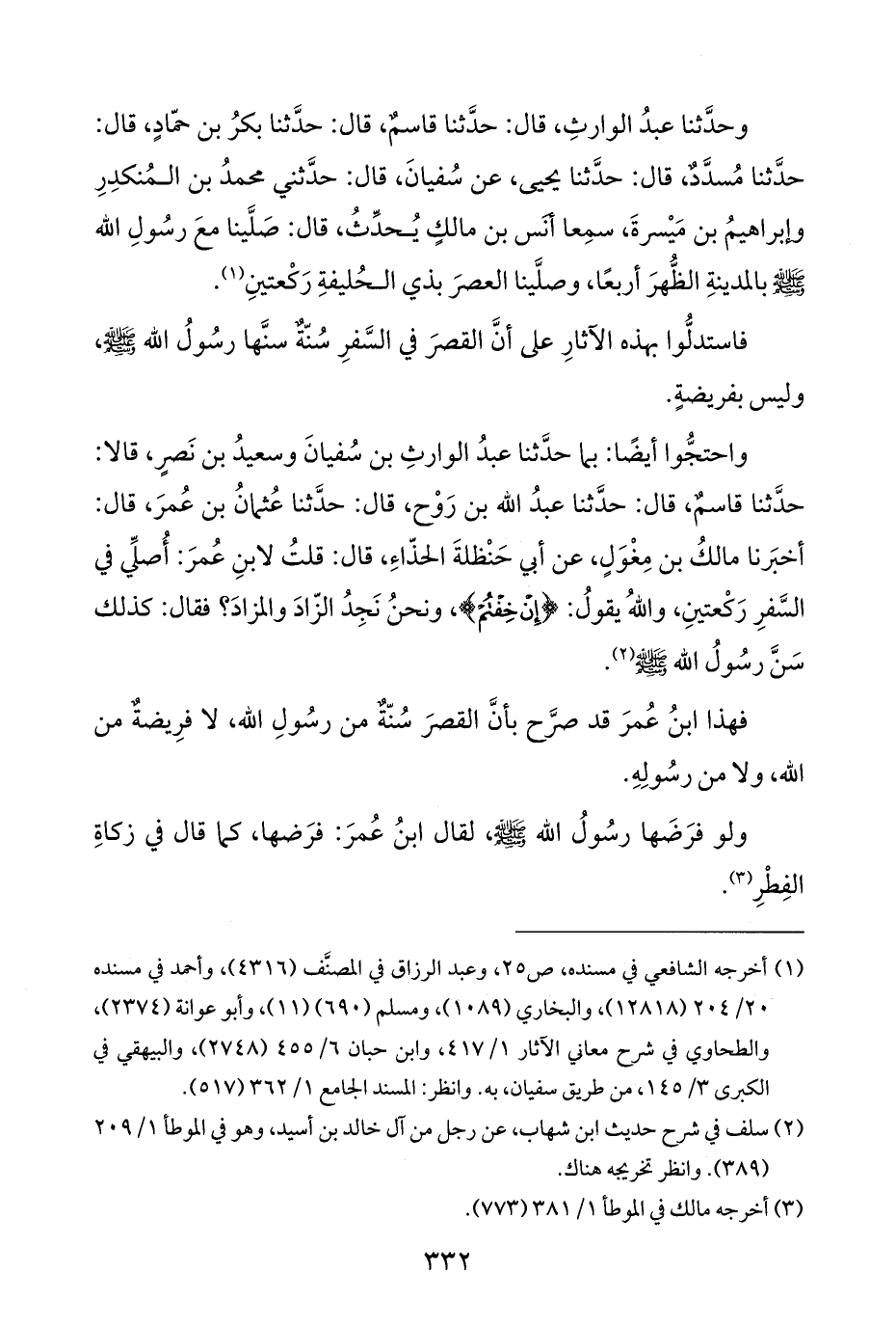 فاستدلُّوا بهذه الآثارِ على أنَّ القصرَ في السَّفرِ سُنّةٌ سنَّها رسولُ اللَّه -صلى اللَّه عليه وسلم-، وليس بفريضةٍ.
