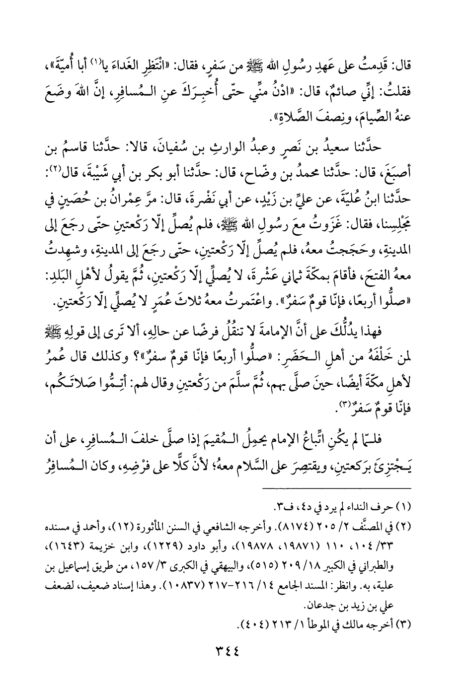 حدَّثنا سعيدُ بن نَصرٍ وعبدُ الوارثِ بن سُفيانَ، قالا: حدَّثنا قاسمُ بن أصبَغَ، قال: حدَّثنا محمدُ بن وضّاح، قال: حدَّثنا أبو بكر بن أبي شَيْبةَ، قال (¬٢): حدَّثنا ابنُ عُليّةَ، عن عليِّ بن زيدٍ، عن أبي نَضْرةَ، قال: مرَّ عِمْرانُ بن حُصَينٍ في مَجْلِسِنا، فقال: غَزَوتُ معَ رسُول اللَّه -صلى اللَّه عليه وسلم-، فلم يُصلِّ إلّا رَكْعتينِ حتّى رجَعَ إلى المدينةِ، وحَجَجتُ معهُ، فلم يُصلِّ إلّا رَكْعتينِ، حتّى رجَعَ إلى المدينةِ، وشهِدتُ معهُ الفتحَ، فأقامَ بمكّةَ ثماني عَشْرةَ، لا يُصلِّي إلّا رَكْعتينِ، ثُمَّ يقولُ لأهْلِ البَلدِ: "صلُّوا أربعًا، فإنّا قومٌ سَفرٌ". واعْتَمرتُ معهُ ثلاثَ عُمَرٍ لا يُصلِّي إلّا رَكْعتينِ.
