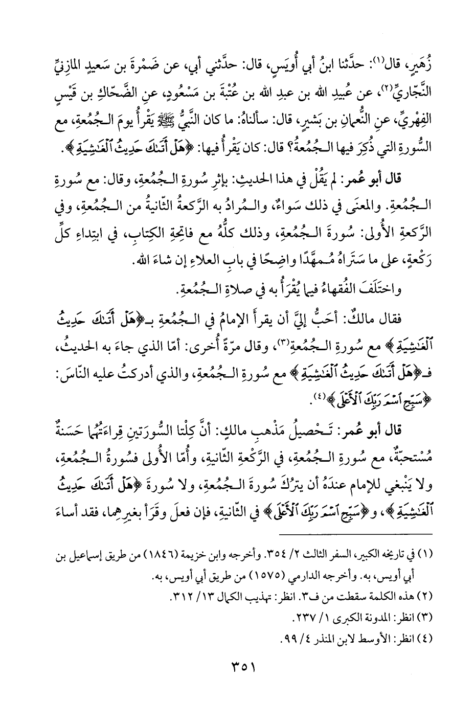 قال أبو عُمر: تَحْصيلُ مَذْهبِ مالكٍ: أنَّ كِلْتا السُّورَتينِ قِراءَتُهُما حَسَنةٌ مُسْتحبّةٌ، مع سُورةِ الجُمُعةِ، في الرَّكْعةِ الثّانيةِ، وأمّا الأُولى فسُورةُ الجُمُعةِ، ولا يَنْبغي للإمام عندَهُ أن يترُكَ سُورةَ الجُمُعةِ، ولا سُورةَ {هَلْ أَتَاكَ حَدِيثُ الْغَاشِيَةِ} و {سَبِّحِ اسْمَ رَبِّكَ الْأَعْلَى} في الثّانيةِ، فإن فعلَ وقَرَأ بغيرِهِما، فقد أساءَ