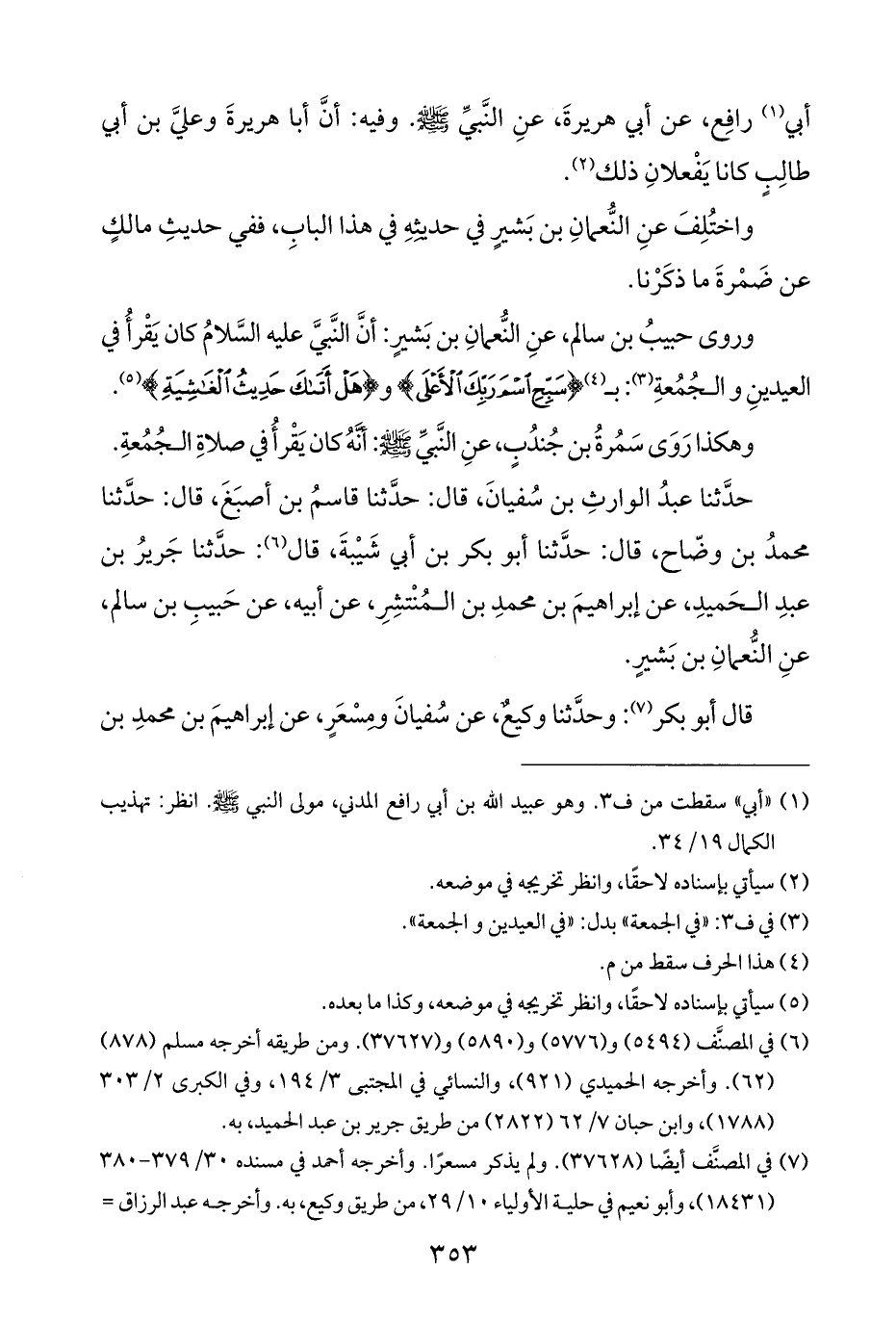 حدَّثنا عبدُ الوارثِ بن سُفيانَ، قال: حدَّثنا قاسمُ بن أصبَغَ، قال: حدَّثنا محمدُ بن وضّاح، قال: حدَّثنا أبو بكر بن أبي شَيْبةَ، قال (¬٦): حدَّثنا جَريرُ بن عبدِ الحَميدِ، عن إبراهيمَ بن محمدِ بن المُنْتشِرِ، عن أبيه، عن حَبيبِ بن سالم، عنِ النُّعمانِ بن بَشيرٍ.
