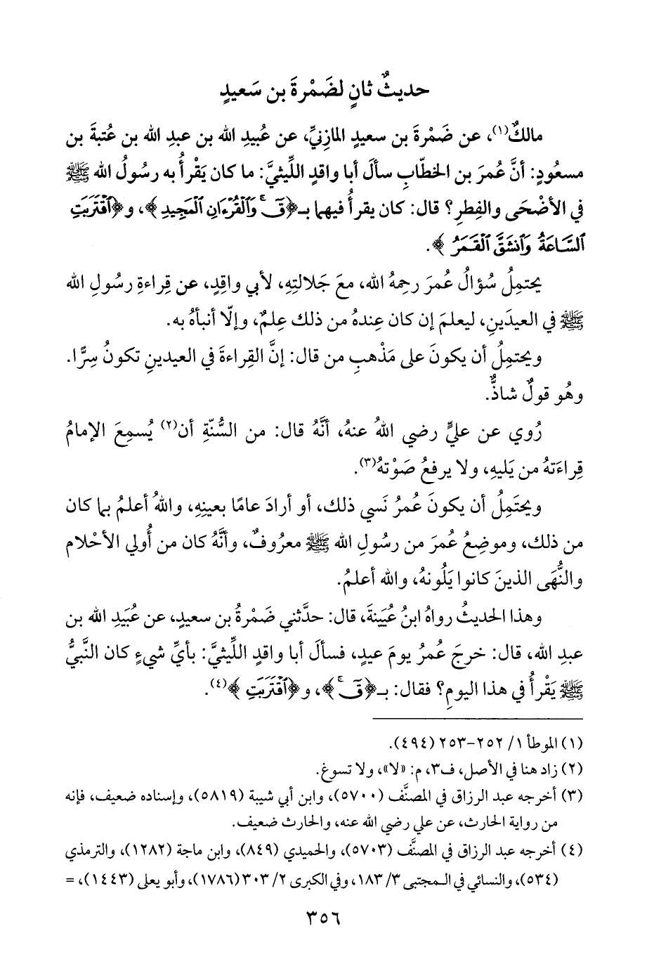 مالكٌ (¬١)، عن ضَمْرةَ بن سعيدٍ المازِنيِّ، عن عُبيدِ اللَّه بن عبدِ اللَّه بن عُتبةَ بن مسعُودٍ: أنَّ عُمرَ بن الخطّابِ سألَ أبا واقدٍ اللِّيثيَّ: ما كان يَقْرأُ به رسُولُ اللَّه -صلى اللَّه عليه وسلم- في الأضْحَى والفِطرِ؟ قال: كان يقرأُ فيهما بـ {ق وَالْقُرْآنِ الْمَجِيدِ}، {اقْتَرَبَتِ السَّاعَةُ وَانْشَقَّ الْقَمَرُ}.