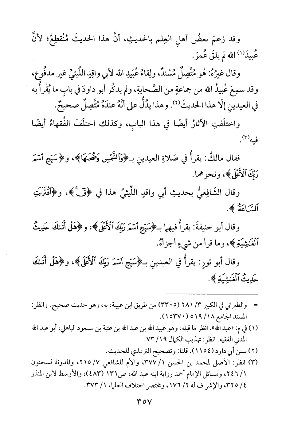 وقال غيرُهُ: هُو مُتَّصِلٌ مُسْندٌ، ولقاءُ عُبَيدِ اللَّه لأبي واقِدٍ اللِّيثيِّ غير مدفُوع، وقد سمِعَ عُبيدُ اللَّه من جماعةٍ من الصَّحابةِ، ولم يذكُر أبو داودَ في بابِ ما يُقْرأُ به في العيدينِ إلّا هذا الحديثَ (¬٢). وهذا يدُلُّ على أَنَّهُ عندَهُ مُتَّصِلٌ صحيحٌ.