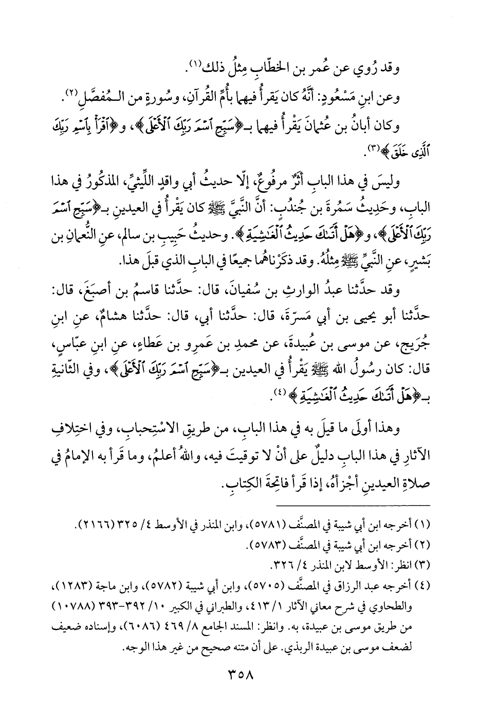 وقد حدَّثنا عبدُ الوارثِ بن سُفيانَ، قال: حدَّثنا قاسمُ بن أصبَغَ، قال: حدَّثنا أبو يحيى بن أبي مَسرّةَ، قال: حدَّثنا أبي، قال: حدَّثنا هشامٌ، عنِ ابنِ جُرَيج، عن موسى بن عُبيدةَ، عن محمدِ بن عَمرِو بن عَطاءٍ، عنِ ابنِ عبّاسٍ، قال: كان رسُولُ اللَّه -صلى اللَّه عليه وسلم- يَقْرأُ في العيدين بـ {سَبِّحِ اسْمَ رَبِّكَ الْأَعْلَى}، وفي الثّانيةِ بـ {هَلْ أَتَاكَ حَدِيثُ الْغَاشِيَةِ} (¬٤).