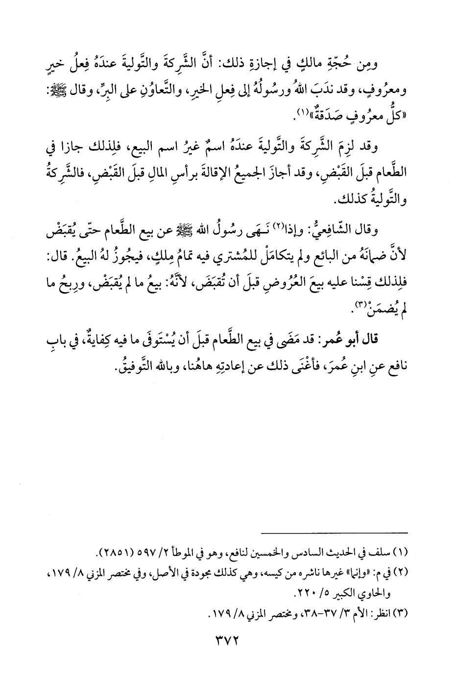 ومِن حُجّةِ مالكٍ في إجازةِ ذلك: أنَّ الشَّرِكةَ والتَّوليةَ عندَهُ فِعلُ خيرٍ ومعرُوفٍ، وقد ندَبَ اللَّهُ ورسُولُهُ إلى فِعلِ الخيرِ، والتَّعاوُنِ على البِرِّ، وقال -صلى اللَّه عليه وسلم-: "كلُّ معرُوفٍ صَدَقةٌ" (¬١).