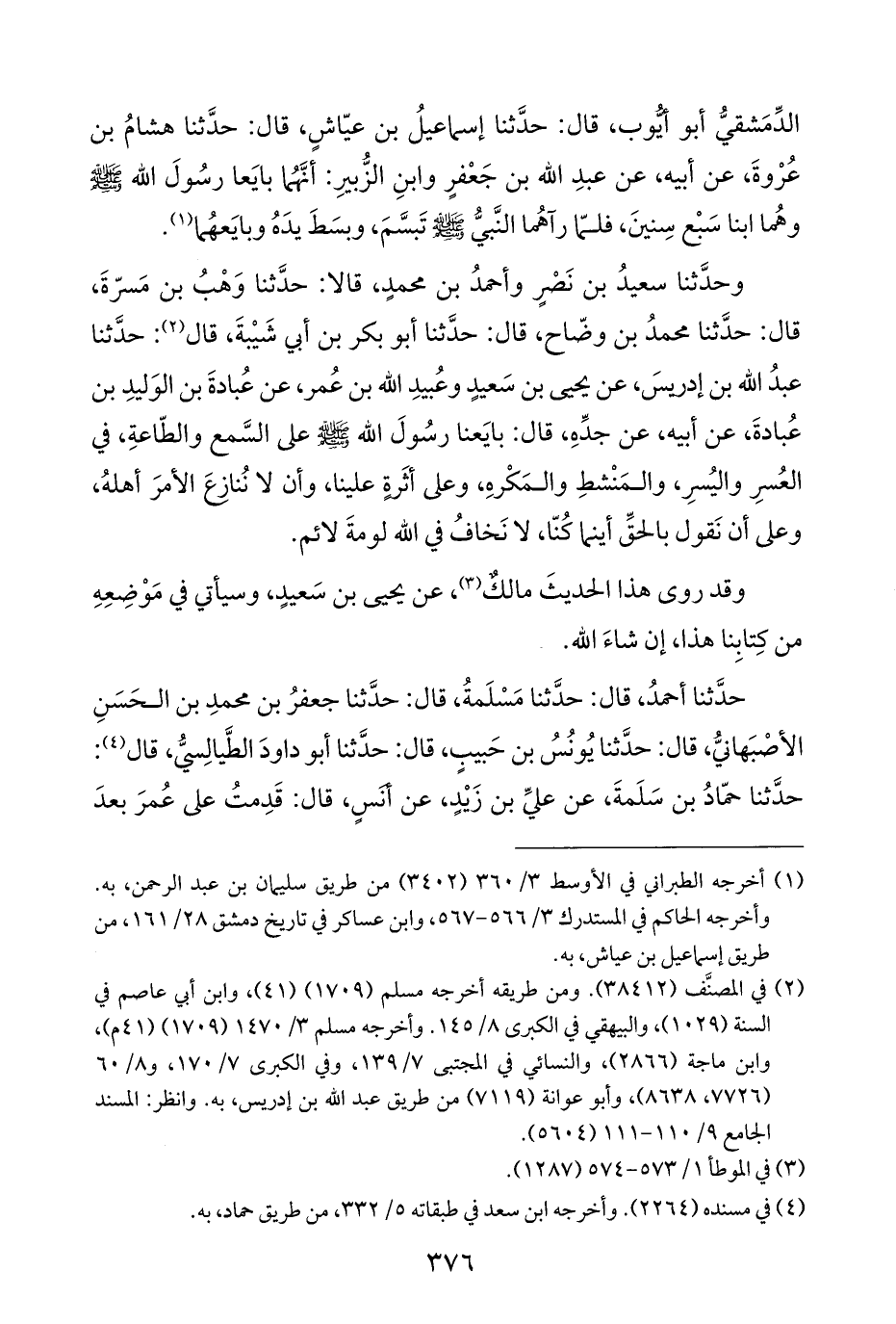 الدِّمَشقيُّ أبو أيُّوب، قال: حدَّثنا إسماعيلُ بن عيّاشٍ، قال: حدَّثنا هشامُ بن عُرْوةَ، عن أبيه، عن عبدِ اللَّه بن جَعْفرٍ وابنِ الزُّبيرِ: أنَّهُما بايَعا رسُولَ اللَّه -صلى اللَّه عليه وسلم- وهُما ابنا سَبْع سِنينَ، فلمّا رآهُما النَّبيُّ -صلى اللَّه عليه وسلم- تَبسَّمَ، وبسَطَ يدَهُ وبايَعهُما (¬١).