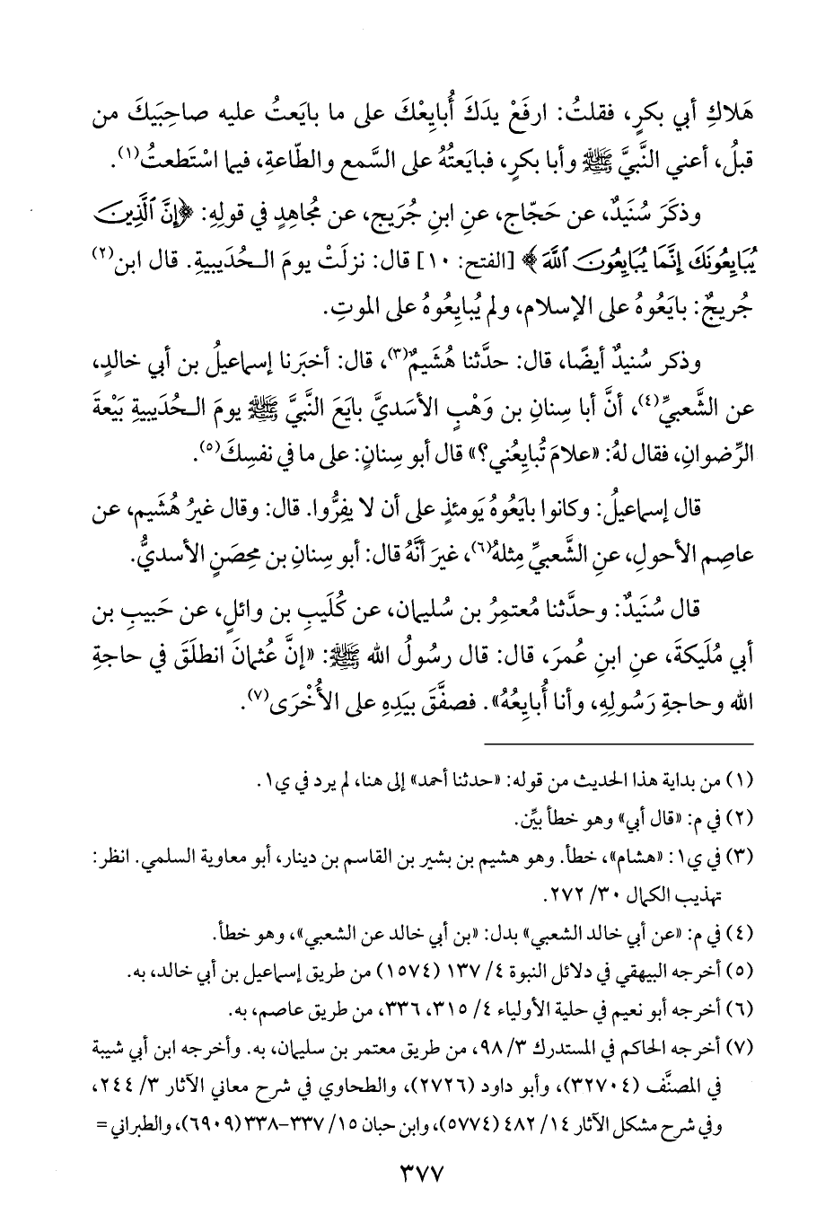 قال سُنَيدٌ: وحدَّثنا مُعتمِرُ بن سُليمان، عن كُلَيبِ بن وائلٍ، عن حَبيبِ بن أبي مُلَيكةَ، عنِ ابنِ عُمرَ، قال: قال رسُولُ اللَّه -صلى اللَّه عليه وسلم-: "إنَّ عُثمانَ انطلَقَ في حاجةِ اللَّه وحاجةِ رَسُولِهِ، وأنا أُبايِعُهُ". فصفَّقَ بيَدِهِ على الأُخْرَى (¬٧).