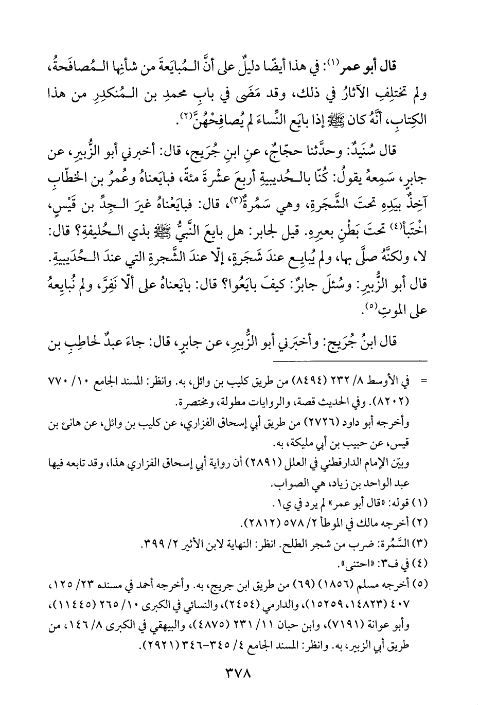 قال سُنَيدٌ: وحدَّثنا حجّاجٌ، عنِ ابنِ جُرَيج، قال: أخبرني أبو الزُّبيرِ، عن جابرٍ، سَمِعهُ يقولُ: كُنّا بالحُديبيةِ أربعَ عشْرةَ مئةً، فبايَعناهُ وعُمرُ بن الخطّابِ آخِذٌ بيَدِهِ تحتَ الشَّجَرةِ، وهي سَمُرةٌ (¬٣)، قال: فبايَعْناهُ غيرَ الجِدِّ بن قَيْسٍ، اخْتَبأ (¬٤) تحتَ بَطْنِ بعيرِهِ. قيل لجابر: هل بايعَ النَّبيُّ -صلى اللَّه عليه وسلم- بذي الحُليفةِ؟ قال: لا، ولكنَّهُ صلَّى بها، ولم يُبايِع عندَ شَجَرةٍ، إلّا عندَ الشَّجرةِ التي عندَ الحُدَيبيةِ. قال أبو الزُّبيرِ: وسُئلَ جابرٌ: كيفَ بايَعُوا؟ قال: بايَعناهُ على ألّا نَفِرَّ، ولم نُبايِعهُ على الموتِ (¬٥).