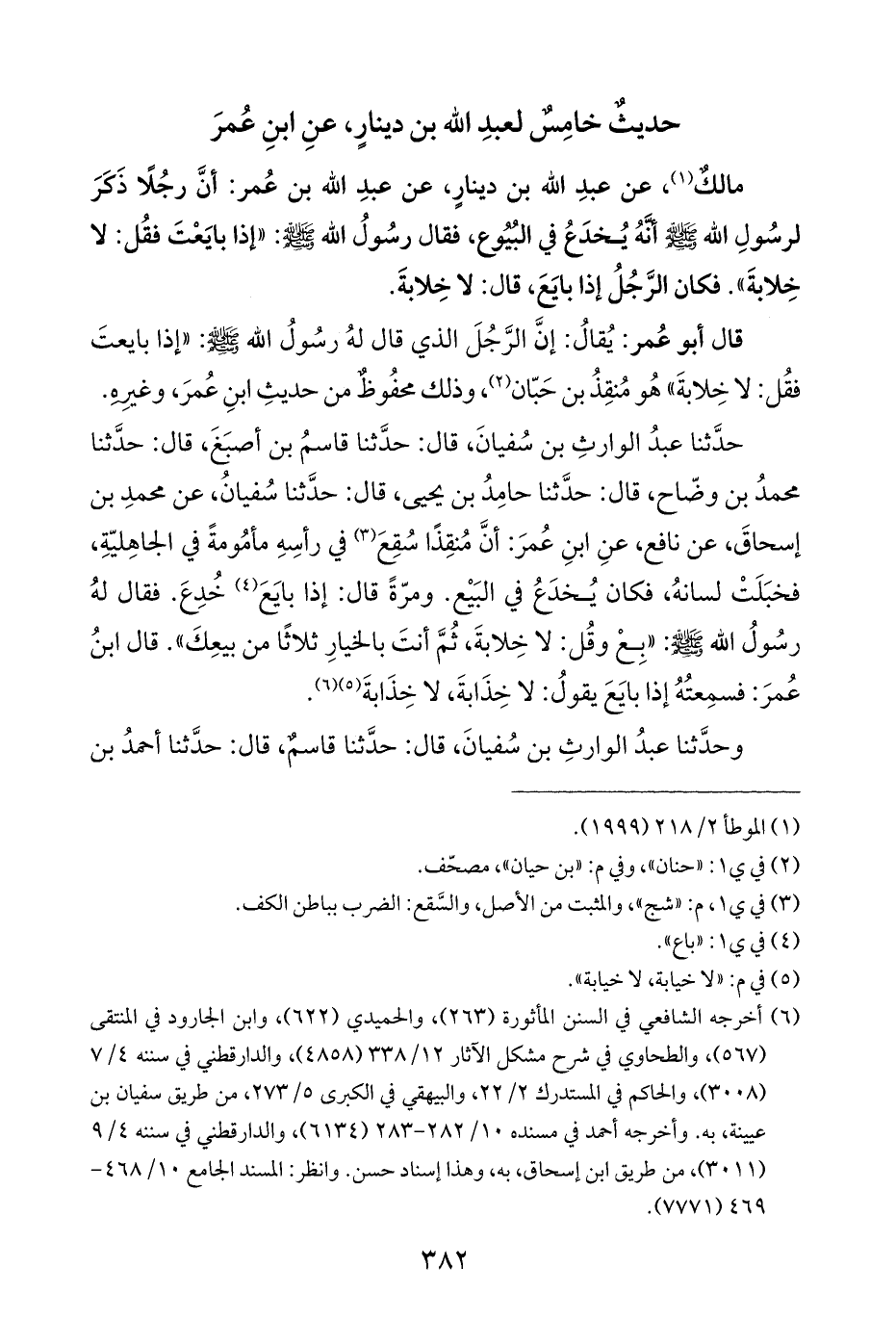 حدَّثنا عبدُ الوارثِ بن سُفيانَ، قال: حدَّثنا قاسمُ بن أصبَغَ، قال: حدَّثنا محمدُ بن وضّاح، قال: حدَّثنا حامِدُ بن يحيى، قال: حدَّثنا سُفيان، عن محمدِ بن إسحاقَ، عن نافع، عنِ ابنِ عُمرَ: أنَّ مُنقِذًا سُقِعَ (¬٣) في رأسِهِ مأمُومةً في الجاهِليّةِ، فخبَلَتْ لسانهُ، فكان يُخدَعُ في البَيْع. ومرّةً قال: إذا بايَعَ (¬٤) خُدِعَ. فقال لهُ رسُولُ اللَّه -صلى اللَّه عليه وسلم-: "بِعْ وقُل: لا خِلابةَ، ثُمَّ أنتَ بالخيارِ ثلاثًا من بيعِكَ". قال ابنُ عُمرَ: فسمِعتُهُ إذا بايَعَ يقولُ: لا خِذَابةَ، لا خِذَابةَ (¬٥) (¬٦).