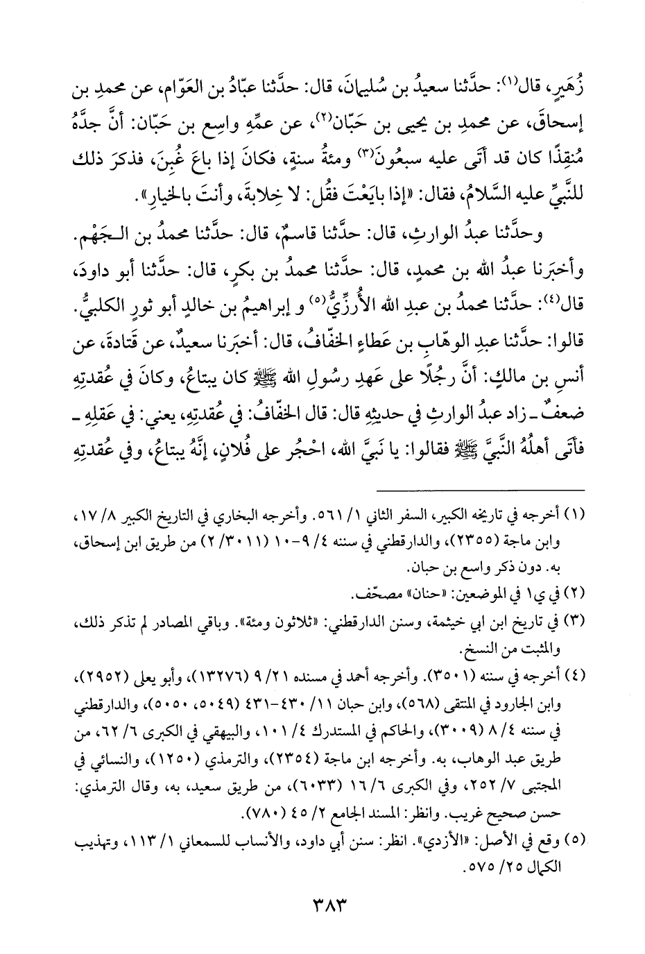 وحدَّثنا عبدُ الوارثِ، قال: حدَّثنا قاسمٌ، قال: حدَّثنا محمدُ بن الجَهْم. وأخبَرنا عبدُ اللَّه بن محمدٍ، قال: حدَّثنا محمدُ بن بكرٍ، قال: حدَّثنا أبو داودَ، قال (¬٤): حدَّثنا محمدُ بن عبدِ اللَّه الأُرزِّيُّ (¬٥) وإبراهيمُ بن خالدٍ أبو ثورٍ الكلبيُّ. قالوا: حدَّثنا عبدِ الوهّابِ بن عَطاءٍ الخفّافُ، قال: أخبَرنا سعيدٌ، عن قَتادةَ، عن أنسِ بن مالكٍ: أنَّ رجُلًا على عَهدِ رسُولِ اللَّه -صلى اللَّه عليه وسلم- كان يبتاعُ، وكانَ في عُقدتِهِ ضعفٌ -زاد عبدُ الوارثِ في حديثهِ قال: قال الخفّافُ: في عُقدتِهِ، يعني: في عَقلِهِ- فأتَى أهلُهُ النَّبيَّ -صلى اللَّه عليه وسلم- فقالوا: يا نَبيَّ اللَّه، احْجُر على فُلانٍ، إنَّهُ يبتاعُ، وفي عُقدتِهِ