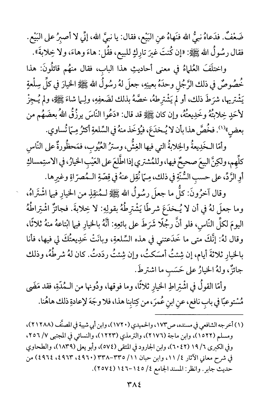 ضَعْفٌ. فدَعاهُ نبيُّ اللَّه فنَهاهُ عنِ البَيْع، فقال: يا نبيَّ اللَّه، إنِّي لا أصبِرُ على البَيْع. فقال رسُولُ اللَّه -صلى اللَّه عليه وسلم-: "إن كُنتَ غيرَ تارِكٍ للبيع، فقُل: هاءَ وهاءَ، ولا خِلابةَ".