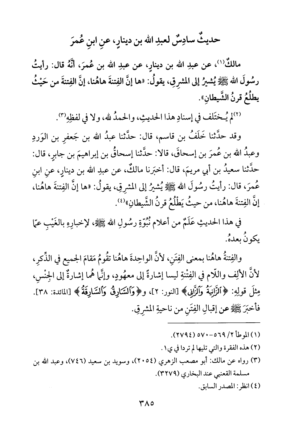 مالكٌ (¬١)، عن عبدِ اللَّه بن دينارٍ، عن عبدِ اللَّه بن عُمرَ، أَنَّهُ قال: رأيتُ رسُولَ اللَّه -صلى اللَّه عليه وسلم- يُشيرُ إلى المشرِقِ، يقولُ: "ها إنَّ الفِتنةَ هاهُنا، إنَّ الفِتنةَ من حَيْثُ يطلُعُ قرنُ الشَّيطانِ".