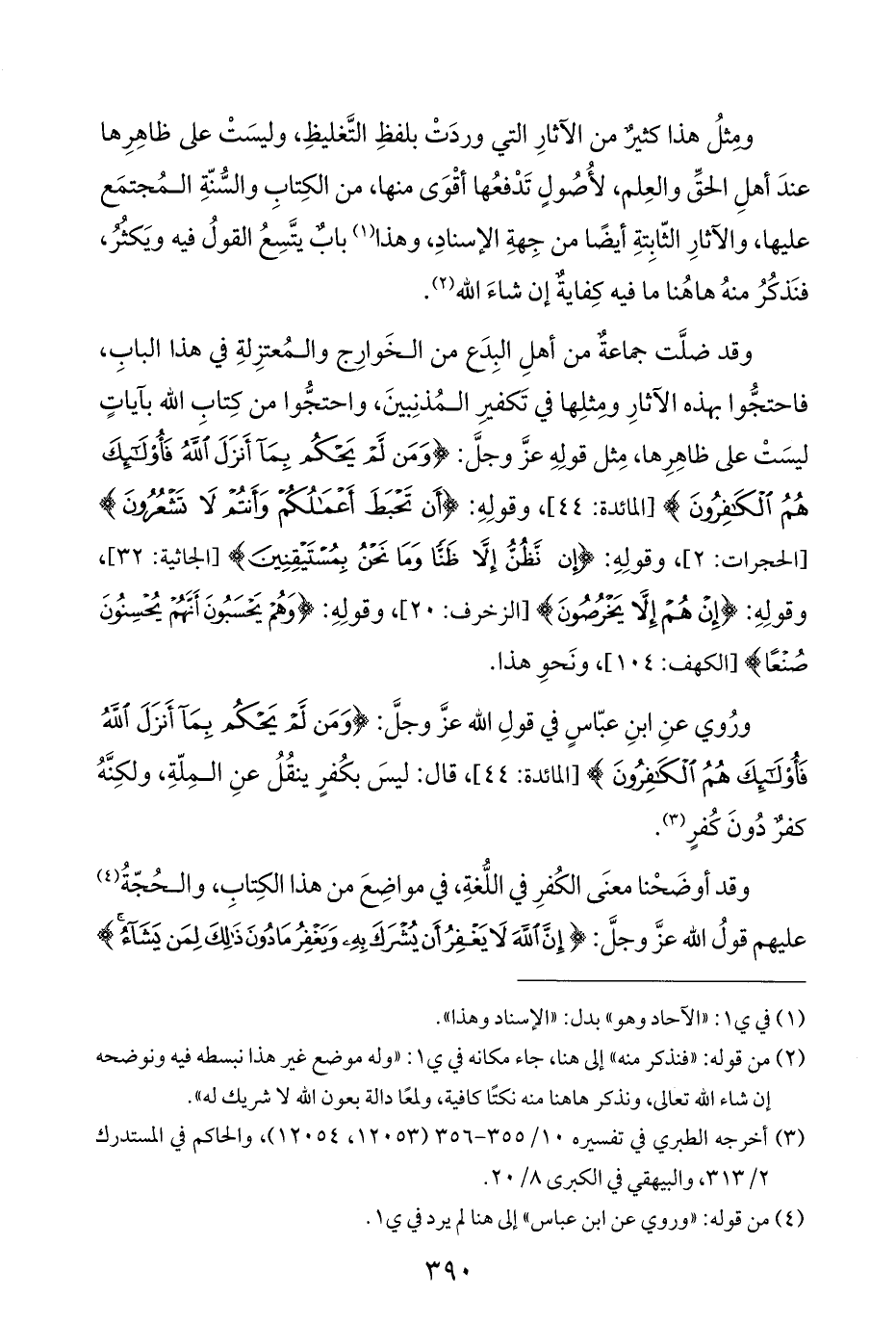 وقد ضلَّت جماعةٌ من أهلِ البِدَع من الخَوارِج والمُعتزِلةِ في هذا البابِ، فاحتجُّوا بهذه الآثارِ ومِثلِها في تَكفيرِ المُذنِبينَ، واحتجُّوا من كِتاب اللَّه بآياتٍ ليسَتْ على ظاهِرِها، مِثل قولِهِ عزَّ وجلَّ: {وَمَنْ لم يَحْكُمْ بِمَا أَنْزَلَ اللَّهُ فَأُولَئِكَ هُمُ الْكَافِرُونَ} [المائدة: ٤٤]، وقولِهِ: {أَنْ تَحْبَطَ أَعْمَالُكُمْ وَأَنْتُمْ لَا تَشْعُرُونَ} [الحجرات: ٢]، وقولِهِ: {إِنْ نَظُنُّ إِلَّا ظَنًّا وَمَا نَحْنُ بِمُسْتَيْقِنِينَ} [الجاثية: ٣٢]، وقولِهِ: {وَإِنْ هُمْ إِلَّا يَخْرُصُونَ} [الزخرف: ٢٠]، وقولِهِ: {وَهُمْ يَحْسَبُونَ أَنَّهُمْ يُحْسِنُونَ صُنْعًا} [الكهف: ١٠٤]، ونَحوِ هذا.